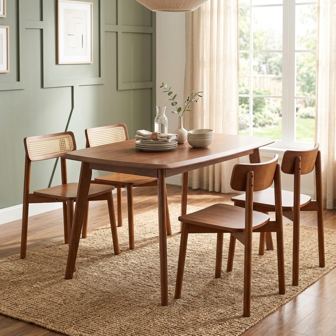 Serlahkan keindahan gaya organik dengan Set Meja Makan 4-Tempat Duduk AMIRA. Diperbuat sepenuhnya daripada kayu getah asli (solid rubberwood), set ini menjanjikan ketahanan yang luar biasa untuk kegunaan harian. Keunikan utamanya terletak pada penyandar kerusi dengan perincian rotan yang memberikan pengudaraan yang baik dan sentuhan estetik klasik. Gabungan material kayu dan rotan ini mencipta suasana makan yang tenang dan eksklusif.
