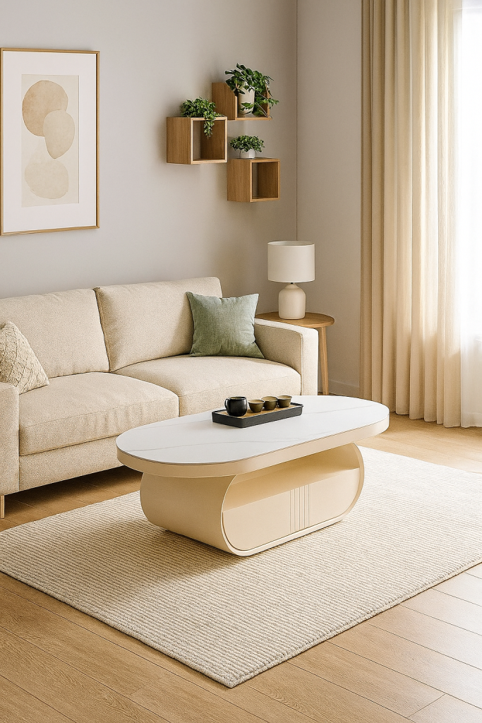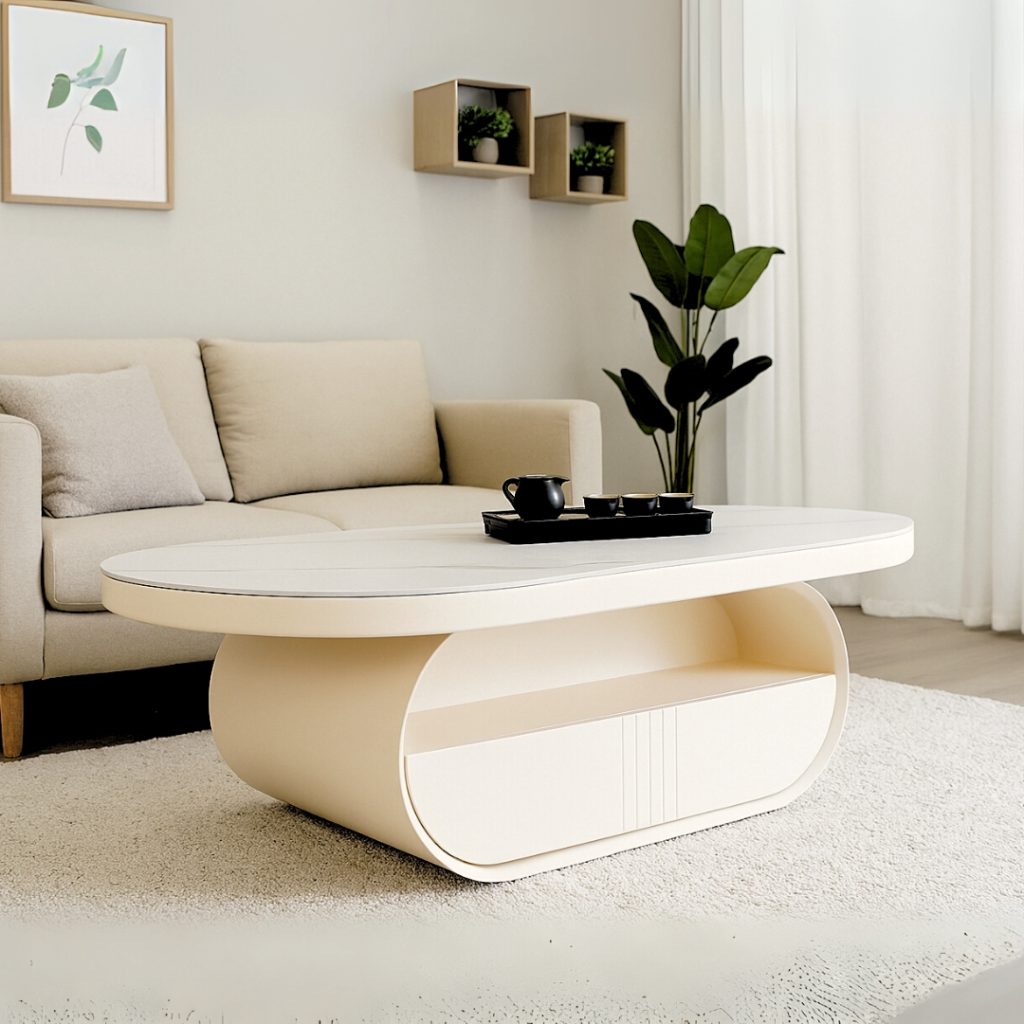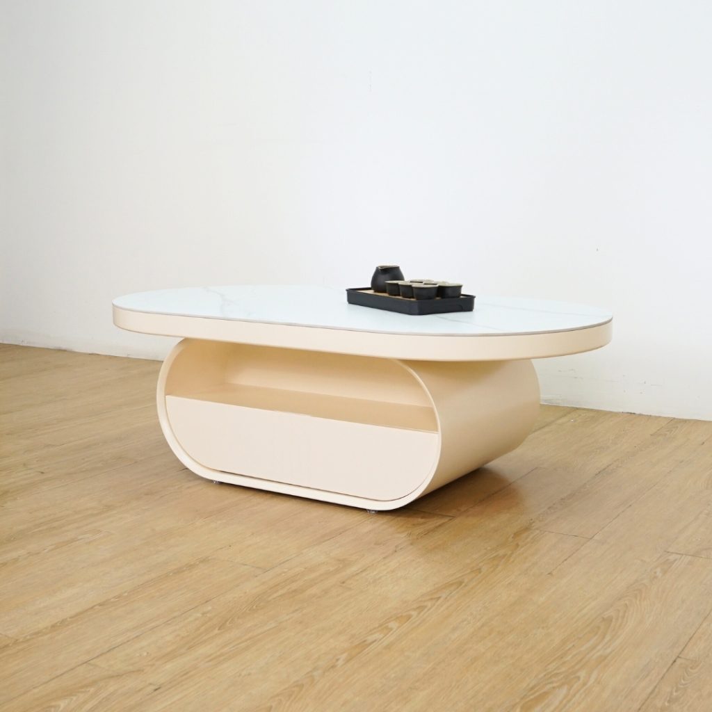 ELENA 椭圆形茶几,以高端岩板桌面呈现优雅质感,耐刮易清洁。柜体采用环保水性漆 MDF 材质,手感细腻。内置实木抽屉,实用收纳与美观并重,完美契合现代客厅风格。