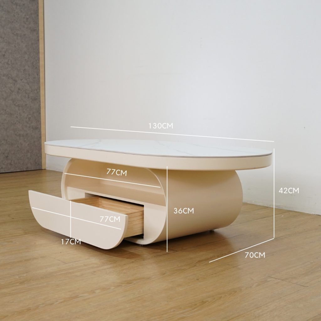 The ELENA Oval-Shaped Coffee Table brings elegance and function to your living space. Featuring a luxurious sintered stone tabletop that’s durable and easy to maintain, it’s paired with a smooth water-based painted MDF body. The built-in drawer box, made from solid wood, provides practical storage for daily essentials. A perfect centerpiece for modern interiors.