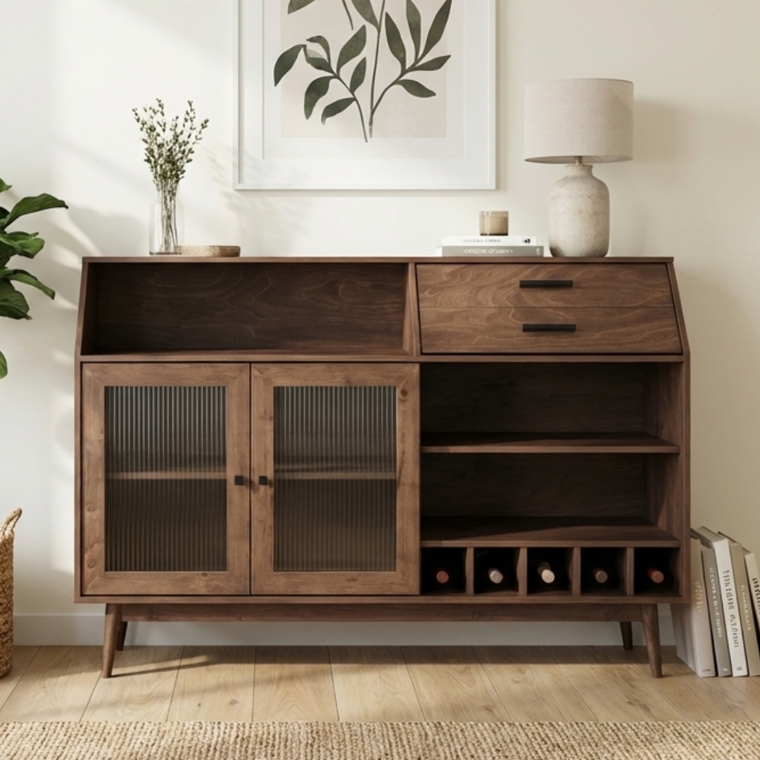 Add a touch of vintage sophistication with the SOLOMAN Wine Storage Sideboard. This 120cm wooden cabinet showcases a stunning retro design that instantly elevates any dining or living room. It features a dedicated wine storage compartment to safely house your bottle collection, alongside ample space for barware and glassware. The stylish privacy glass doors offer an elegant way to display or discreetly conceal contents. SOLOMAN is the perfect blend of nostalgic charm and modern entertaining functionality.