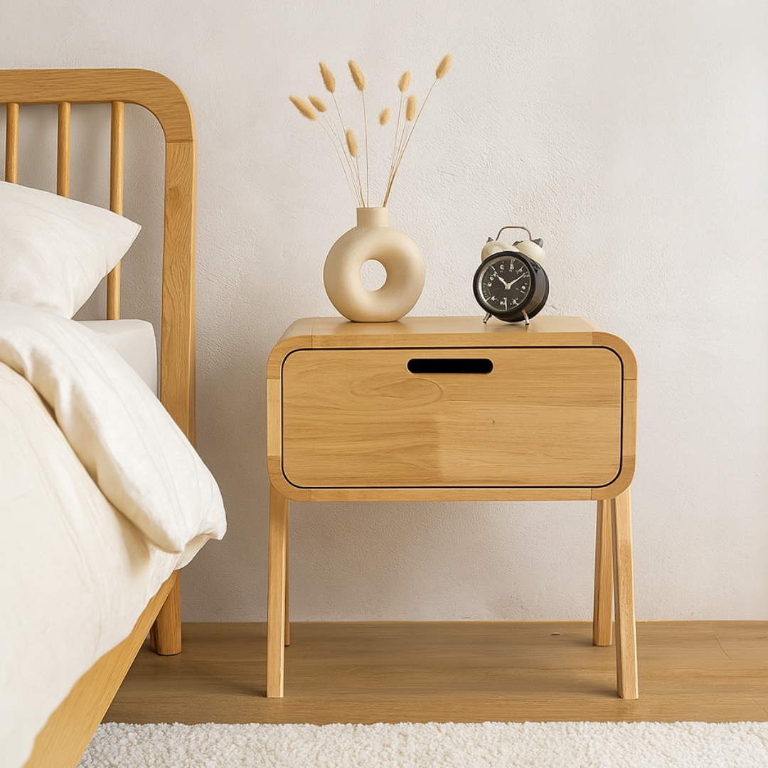 The AGOS Bedside Table is crafted from full solid wood, combining durability with timeless beauty. Designed with large arc-shaped corner edges for added safety and a soft aesthetic, it’s perfect for any bedroom style. The full-extension drawer runner allows smooth access to stored items, while its stackable design offers flexible use as a side table or layered storage unit.