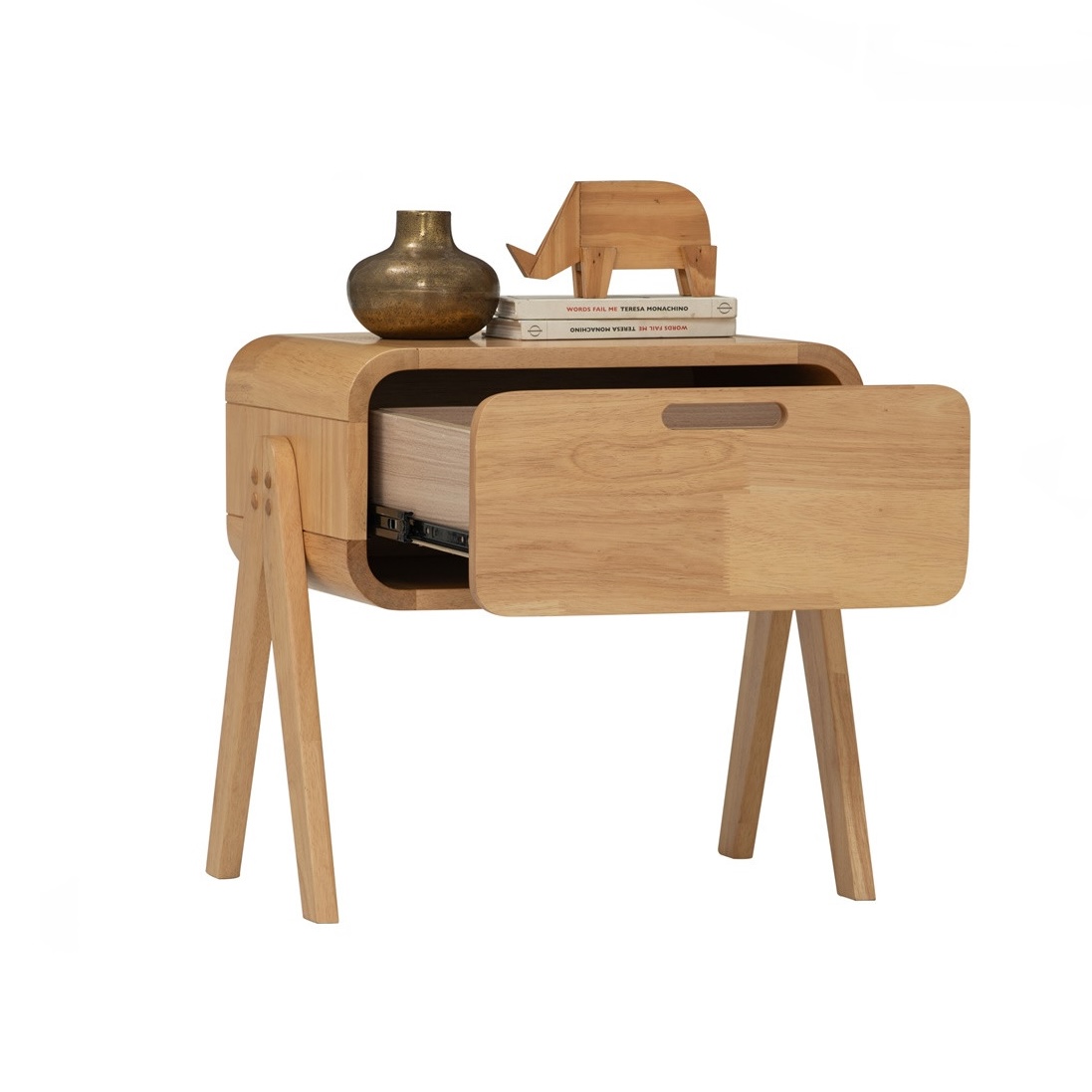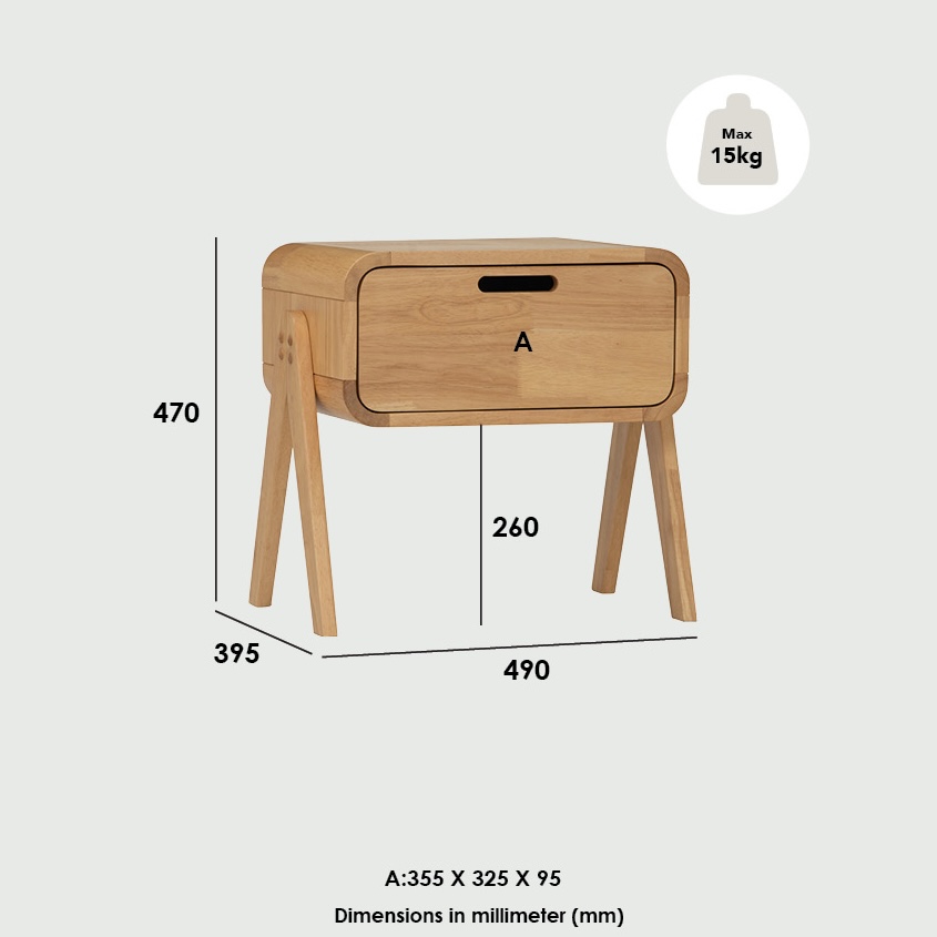 Meja Sisi Katil AGOS diperbuat sepenuhnya daripada kayu padu, tahan lama dan bergaya semula jadi. Reka bentuk bucu besar berbentuk lengkung meningkatkan keselamatan dan penampilan lembut. Laci dengan peluncur lanjutan penuh memudahkan akses, dan reka bentuk boleh disusun memberi fleksibiliti penggunaan tambahan.