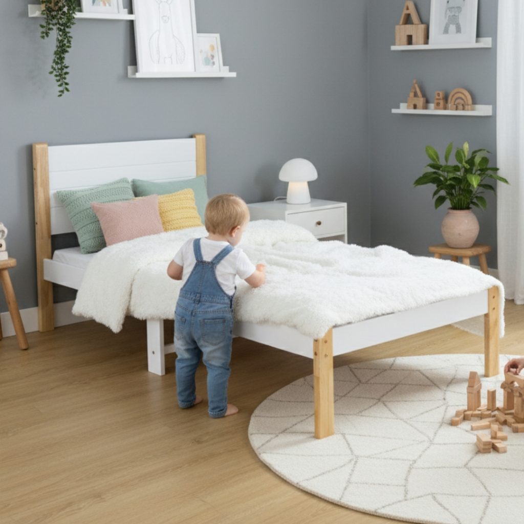 Introducing the ALICE kids single bed, crafted from solid rubberwood for durability. This charming bed features a white frame with natural color bed posts, creating a delightful color combination. Perfect for children’s bedrooms, it offers both style and sturdiness. Let your child sleep in comfort and style with the ALICE kids single bed, where quality meets playful design.