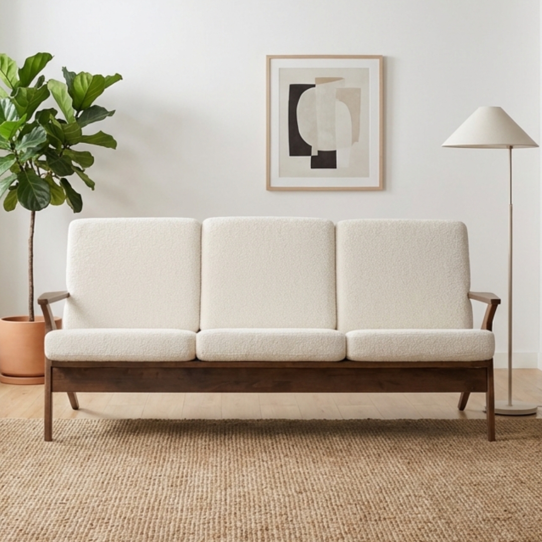 Experience the pinnacle of Mid-Century Modern sophistication with the ASTON 3-Seater Sofa. Masterfully crafted with a Malaysian Oak and bentwood frame, this piece features Walnut veneer detailing on the handles for a refined touch. The rich Cocoa-colored frame provides a warm, elegant foundation, beautifully contrasted by the luxurious Pearl White Furry Fabric cushion. Whether for an upscale living room or a boutique hospitality setting, the ASTON sofa is a timeless statement of craftsmanship. Available in 1, 2, and 3-seater options to suit any space.