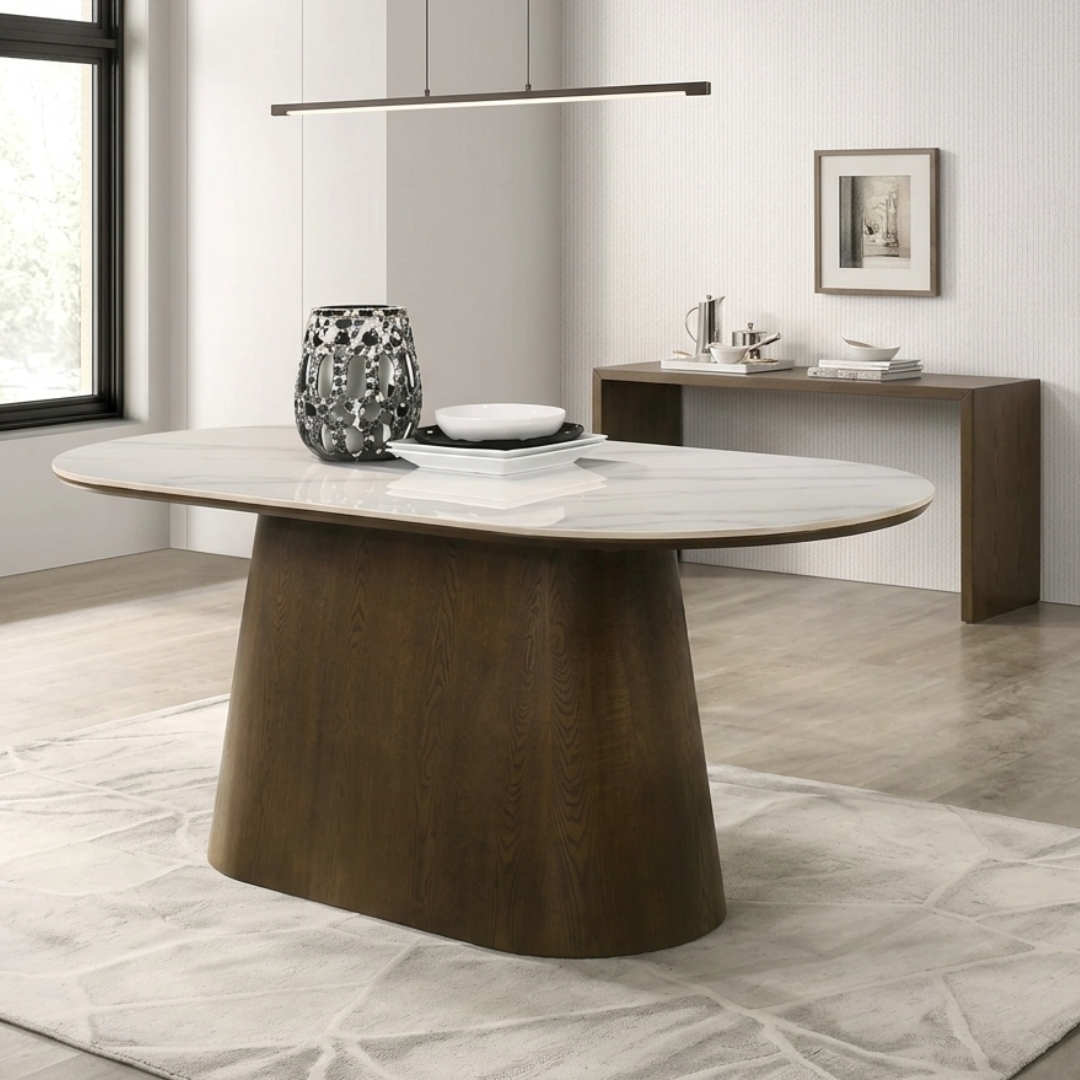 AMAT 椭圆形岩板餐桌,将现代轻奢与自然质感完美融合。桌面采用高级岩板(Sintered Stone)材质,具有极高的硬度,耐高温、防刮花且易于清洁,历久弥新。优雅的椭圆形设计打破了空间的沉闷感,让用餐氛围更加亲近和谐。底部支撑采用坚固耐用的全实木橡胶木底座,稳重而不失格调。提供三种规格选择:150厘米、180厘米及210厘米,满足从温馨小聚到豪华宴请的不同空间需求。