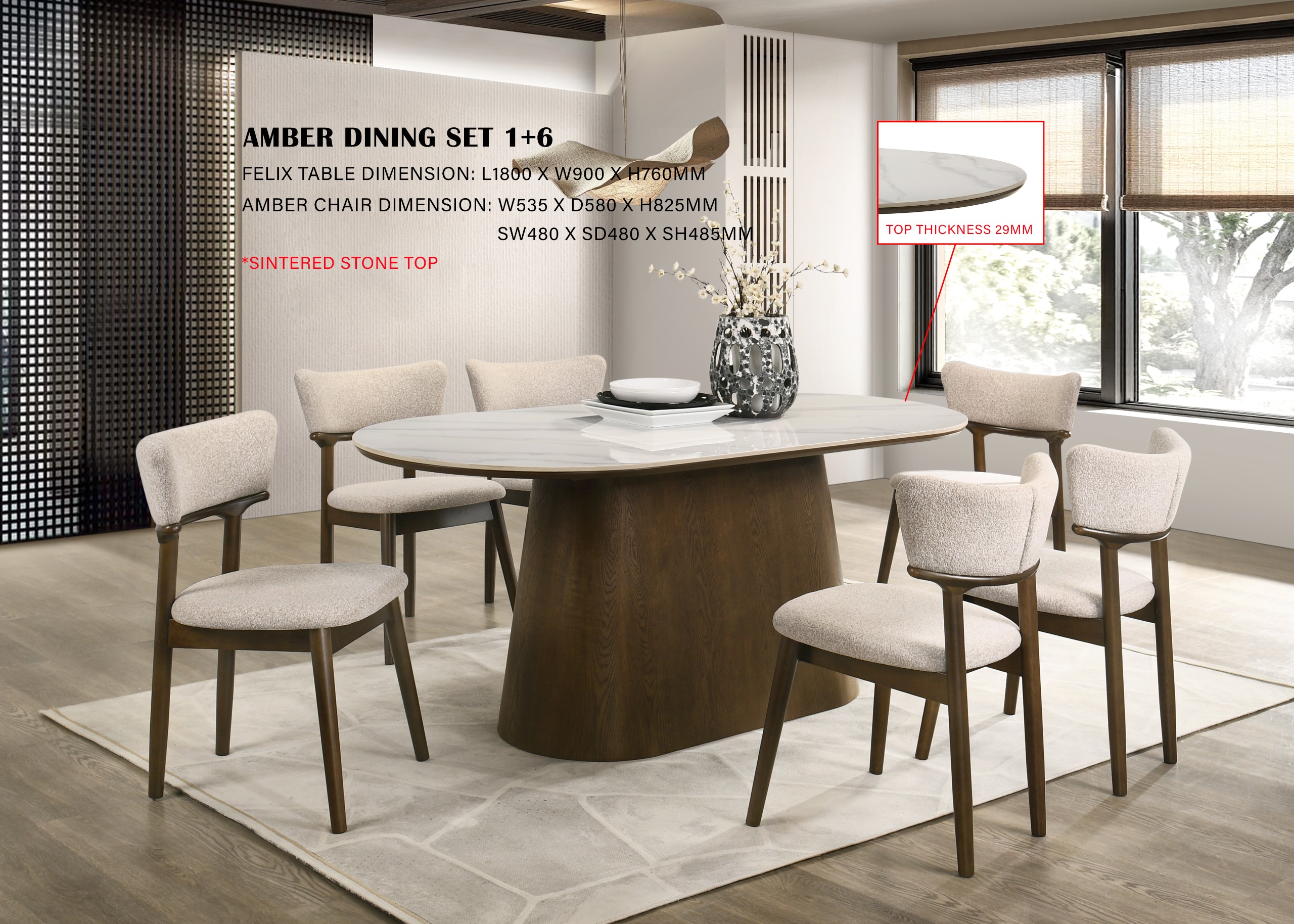 Gabungan kemewahan dan ketahanan kini hadir dalam bentuk Meja Makan Bujur AMAT. Menampilkan permukaan Sintered Stone yang premium, ia tahan haba, kalis calar, dan sangat mudah dibersihkan. Rekaan bentuk bujur (oval) memberikan aliran ruang yang lebih lembut serta menggalakkan interaksi semasa makan. Ia disokong oleh tapak kayu getah asli (solid rubberwood) yang sangat teguh dan stabil. Tersedia dalam tiga pilihan saiz mengikut keperluan anda: panjang 150sm, 180sm, dan 210sm.