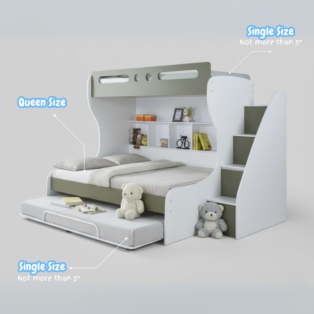 The AYSHA Ladder Trio Bunk Bed with Pull-Out Bed features a smart single-over-queen design with an additional pull-out single bed at the bottom. Perfect for siblings, guests, or shared rooms, it maximizes space while ensuring comfort. A sturdy side ladder provides safe and easy access to the top bunk—practical, stylish, and family-friendly.