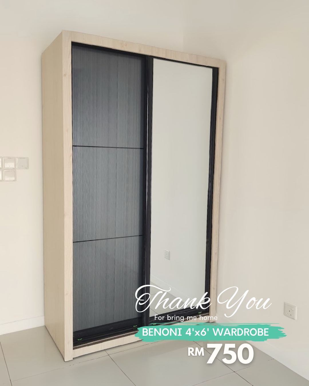 The BENONI 4’x6′ Sliding Door Wardrobe offers a sleek storage solution for modern bedrooms. Made from durable particle board, it features a stylish high gloss grey door panel combined with a full-length mirror on one side—perfect for daily dressing and creating a spacious feel. Inside, it’s equipped with 2 levels of hanging rods, a lockable drawer, and ample compartments for organized storage. Available in white wash or walnut finish.