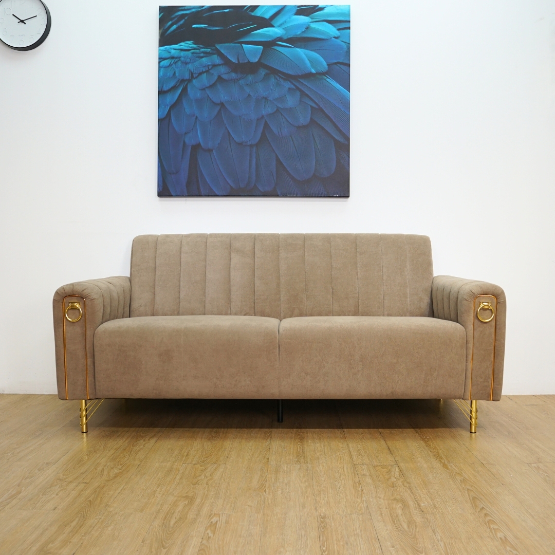 Sofa 3 Tempat Duduk BIANCA menampilkan gaya mewah moden. Dibalut fabrik baldu mesra haiwan peliharaan yang lembut dan senang diselenggara. Kaki logam krom emas dan rekaan pemegang cincin di lengan menambah elemen glamor. Pilihan sempurna untuk ruang tamu elegan yang mengutamakan gaya dan keselesaan.