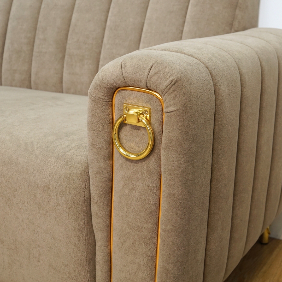 BIANCA 三人沙发采用宠物友好丝绒面料,柔软舒适,易于清洁,兼顾美感与实用性。搭配金色电镀金属脚与扶手圆环拉手设计,尽显奢华质感。整体造型时尚大气,是现代家居的视觉焦点与舒适享受兼具的理想之选。