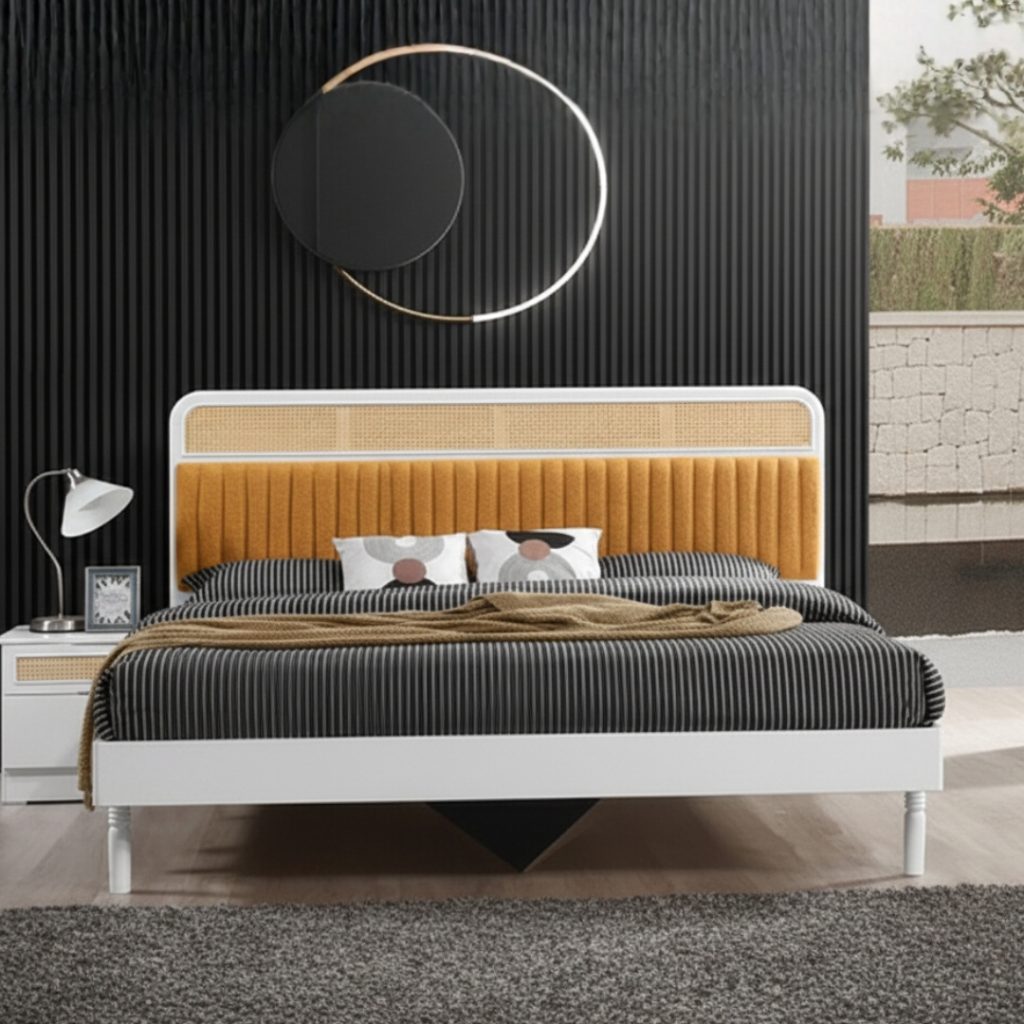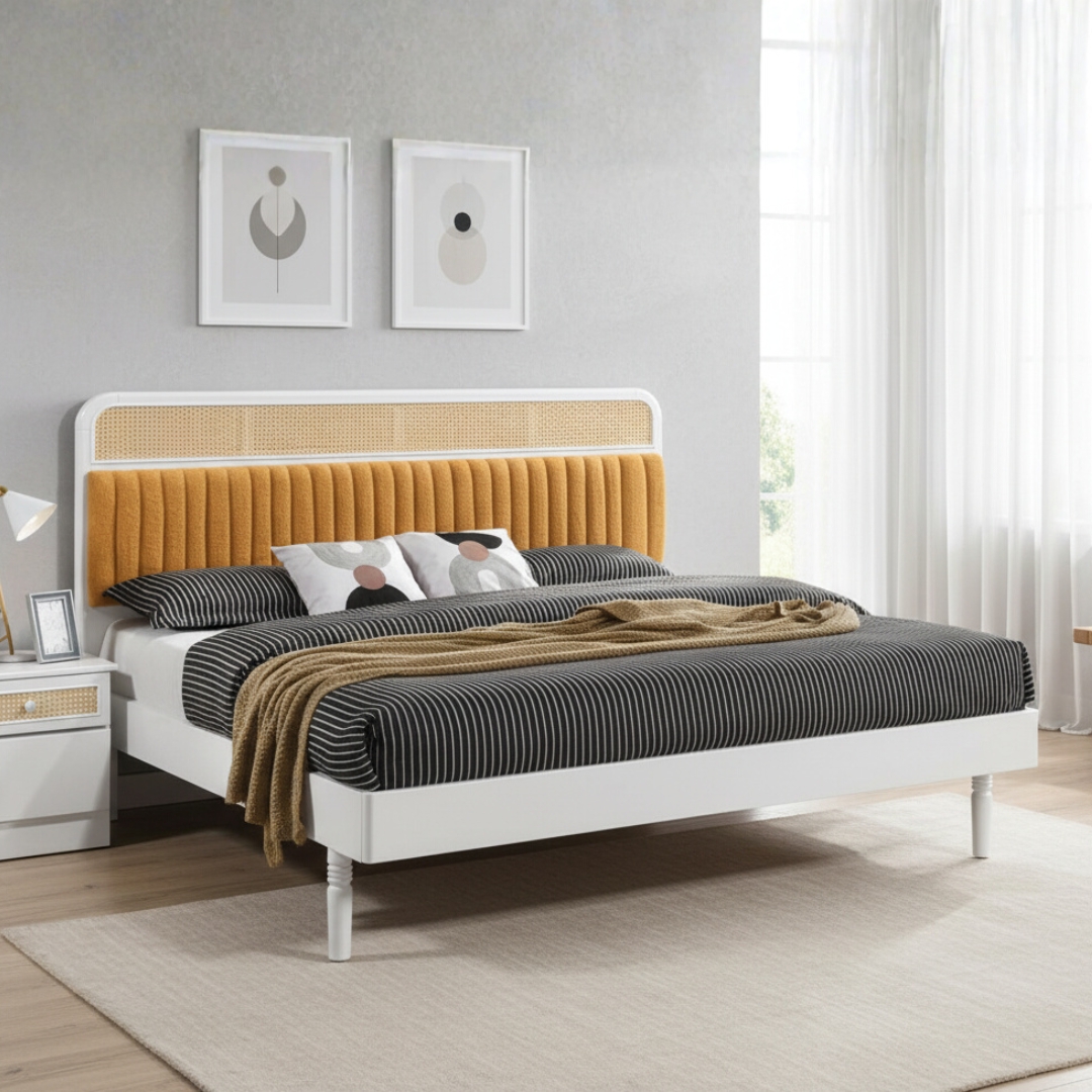 Synthetic rattan features and fleece fabric cushion on headboard panel
