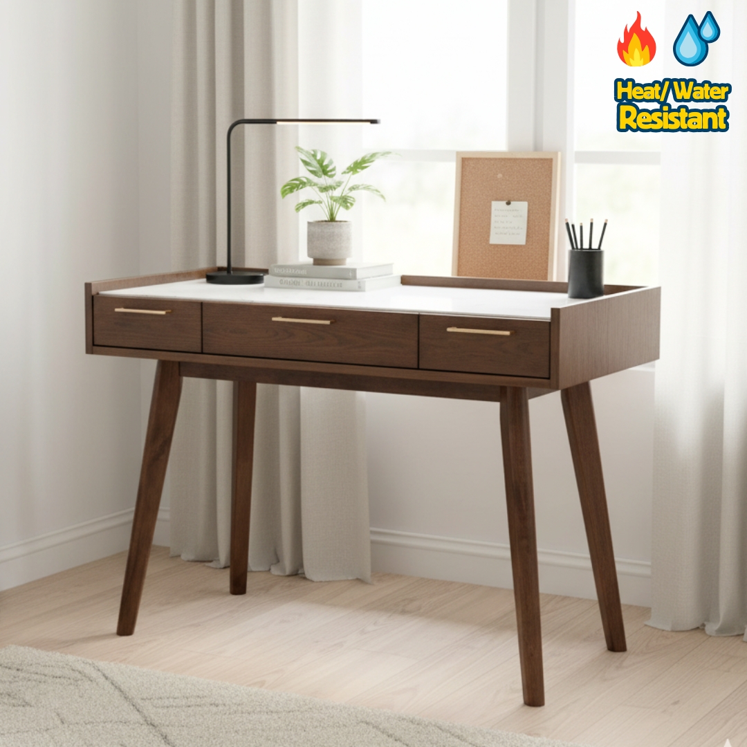 Introducing the BREDA Study Desk, a perfect blend of style and functionality for your workspace. Featuring solid rubberwood legs for sturdy support and a waterproof melamine tabletop that ensures durability and easy cleaning. The desk comes with three spacious drawers adorned with elegant brass handles, providing ample storage for all your essentials. Upgrade your study or office with the BREDA Study Desk and experience the perfect combination of elegance and practicality.