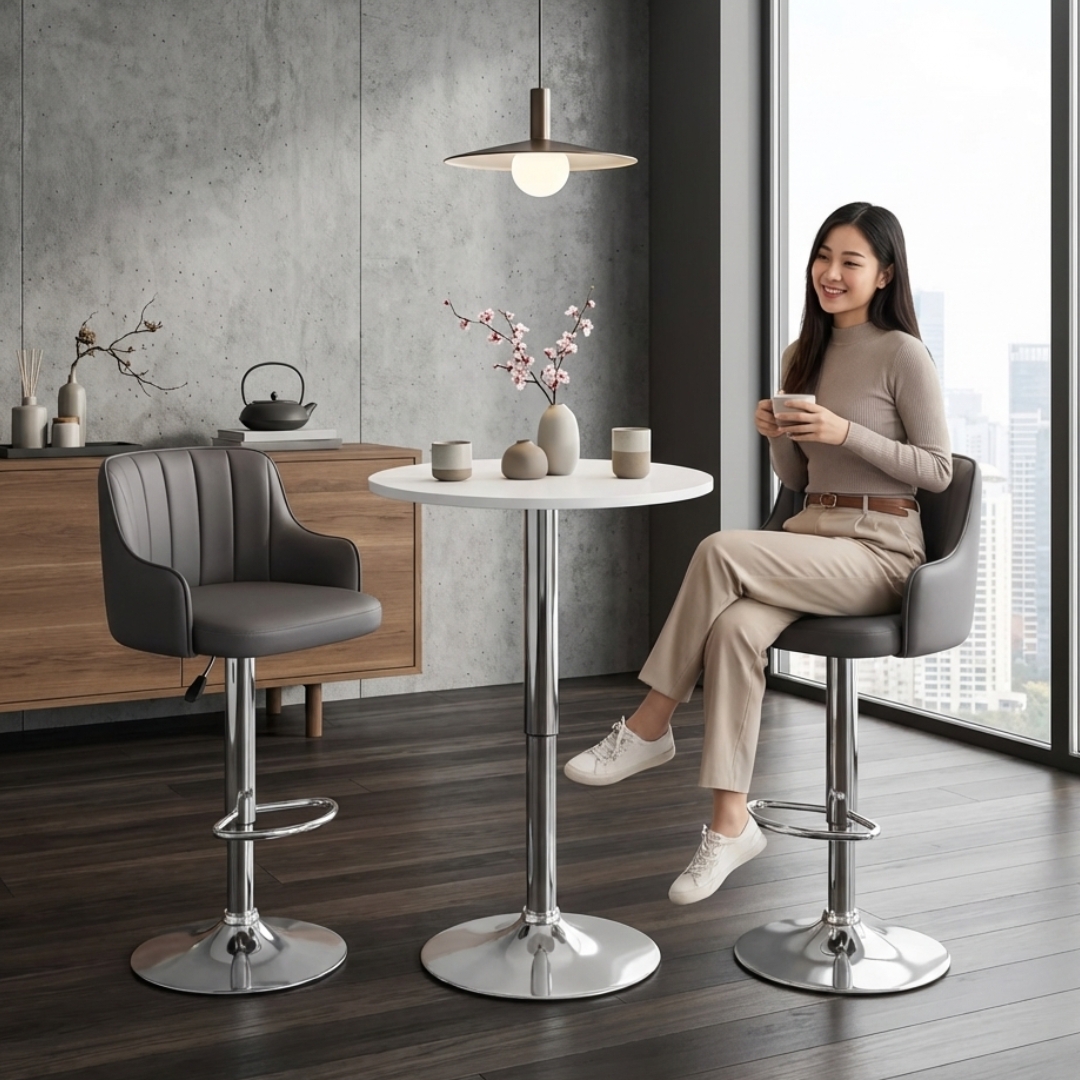 BURANO 双人位吧台桌椅套装,为您打造充满现代感的居家吧台。这款套装主打灵活实用,吧台桌与吧椅均具备可升降调节功能,让您可以根据需求自由调整高度。吧椅采用高品质 PU 皮革座垫,触感舒适且极易打理;搭配不锈钢材质的脚踏设计,不仅稳固耐用,更增添了一抹利落的金属质感。是现代公寓或餐厅角落的完美点缀。