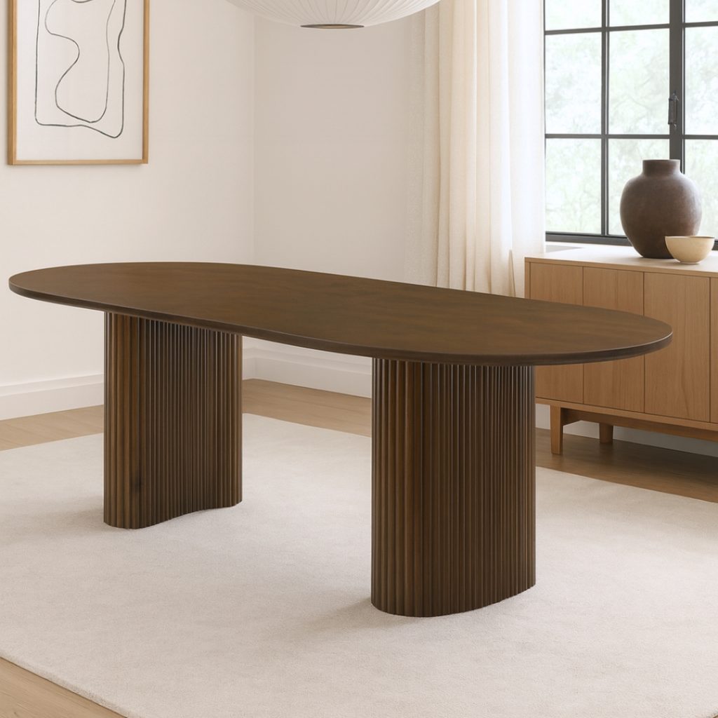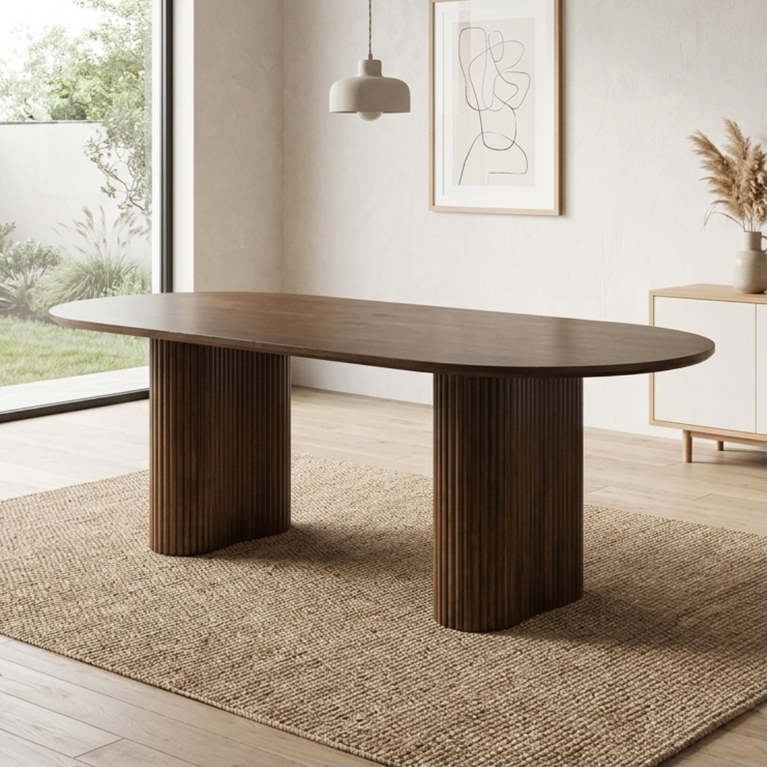 The COSCO Solid Wood Dining Table blends soft curves with timeless craftsmanship. Its oval-shaped, 28mm thick tabletop is made from full solid rubberwood for durability and elegance. The slatted table base offers both stability and an airy, stylish look. Available in rich Walnut or light Beech, COSCO brings a natural, Japanese-inspired warmth to any dining space.