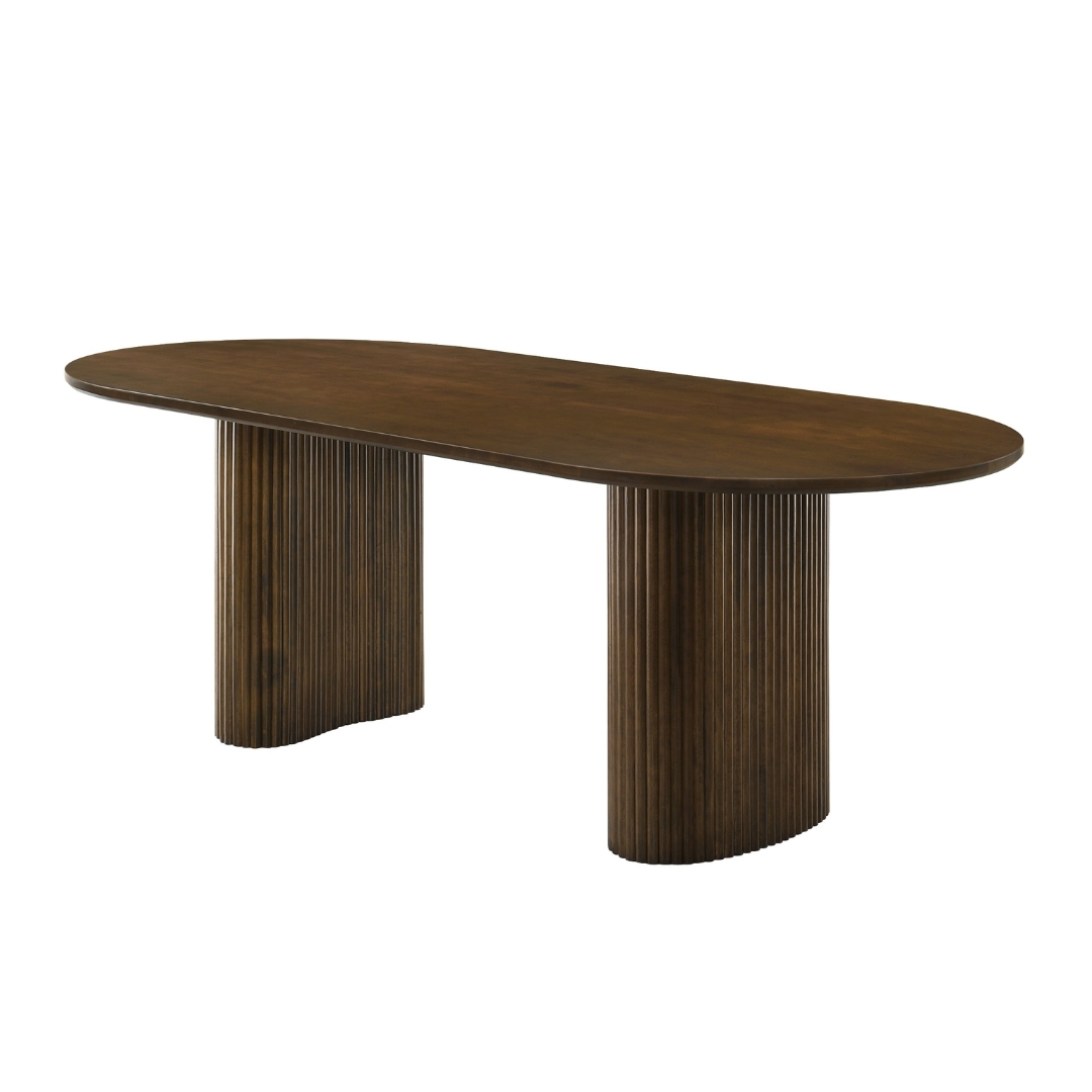 COSCO 实木餐桌以柔和的椭圆造型,诠释日式的温润与雅致。全实心橡胶木打造,28mm 厚桌面稳固耐用,触感细腻。格栅式桌脚设计,稳固中透出通透感,为餐厅增添自然气息。提供胡桃色与榉木色两种选择,无论是温暖沉稳的用餐氛围,还是清新自然的居家风格,都能轻松搭配。