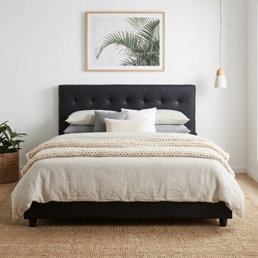 The CUBY Black PU Divan Bed Frame adds sleek sophistication to any bedroom. Featuring a matt black PU leather finish, it comes with a stylish checkbox-patterned tufted headboard. Supported by waterproof plastic legs, this bed frame is both durable and easy to maintain—perfect for modern, minimalist interiors.