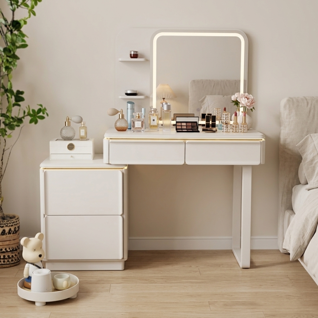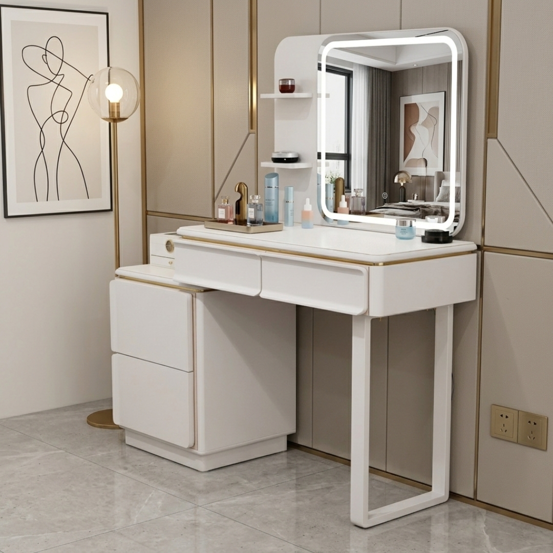 选用 DAVOS LED 智能梳妆台套装,开启精致华丽的美妆体验。 这款梳妆台配备了带有触摸感应器的 LED 镜子,可随心调节灯光亮度,确保每一处妆容细节都完美无瑕。整套设计极具高级感,桌边与配套梳妆凳边缘均镶嵌了优雅的金色装饰条。其可伸缩桌面设计能灵活适应不同的房间布局,将高端奢华的美学与实用的现代功能完美结合,是您卧室中的点睛之笔。