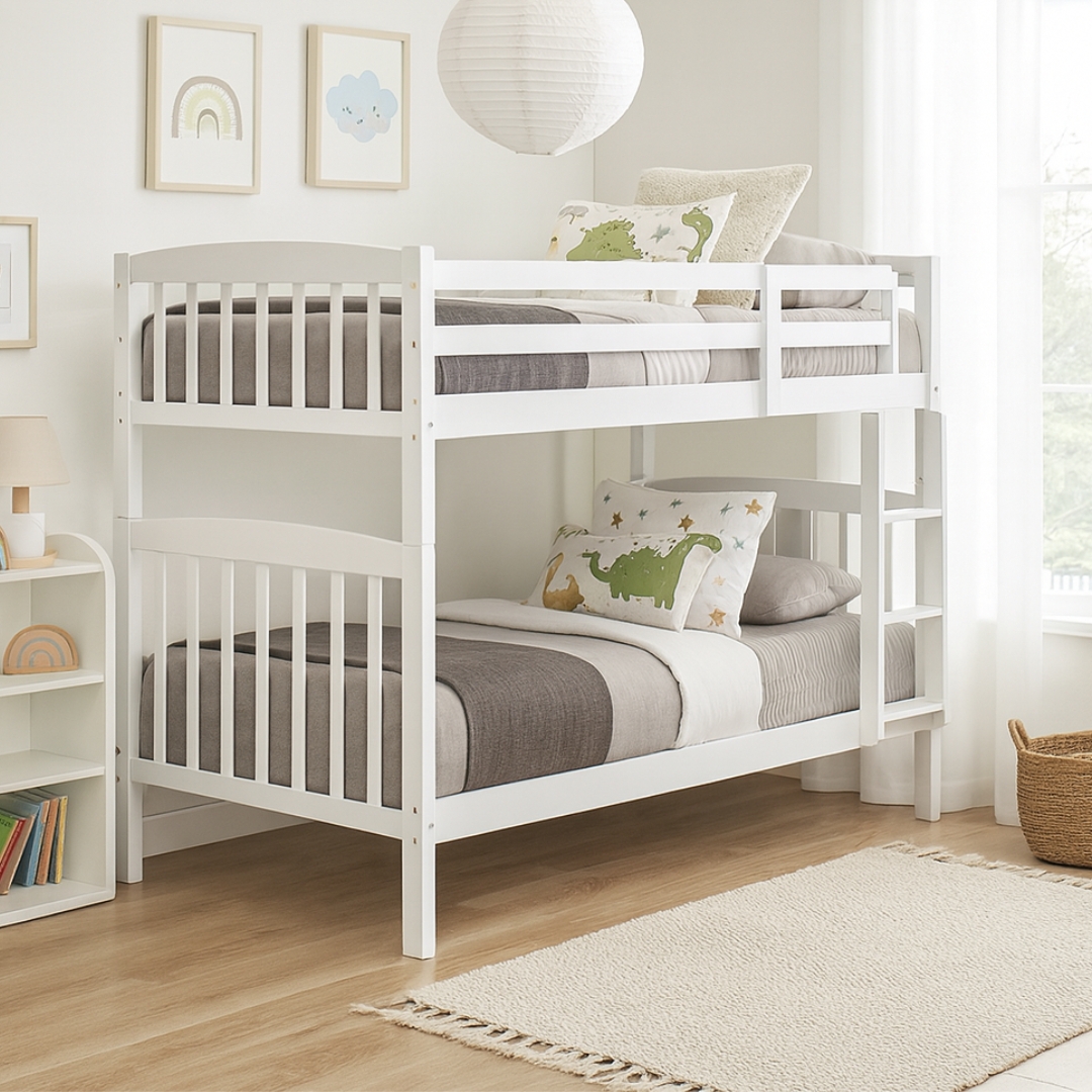 The DEBORAH Bunk Bed is crafted from solid rubberwood with a clean white painted finish. Designed for durability and style, it saves space while offering flexibility—the bunk can be easily converted into two separate single beds. Perfect for kids’ rooms, growing families, or shared spaces.