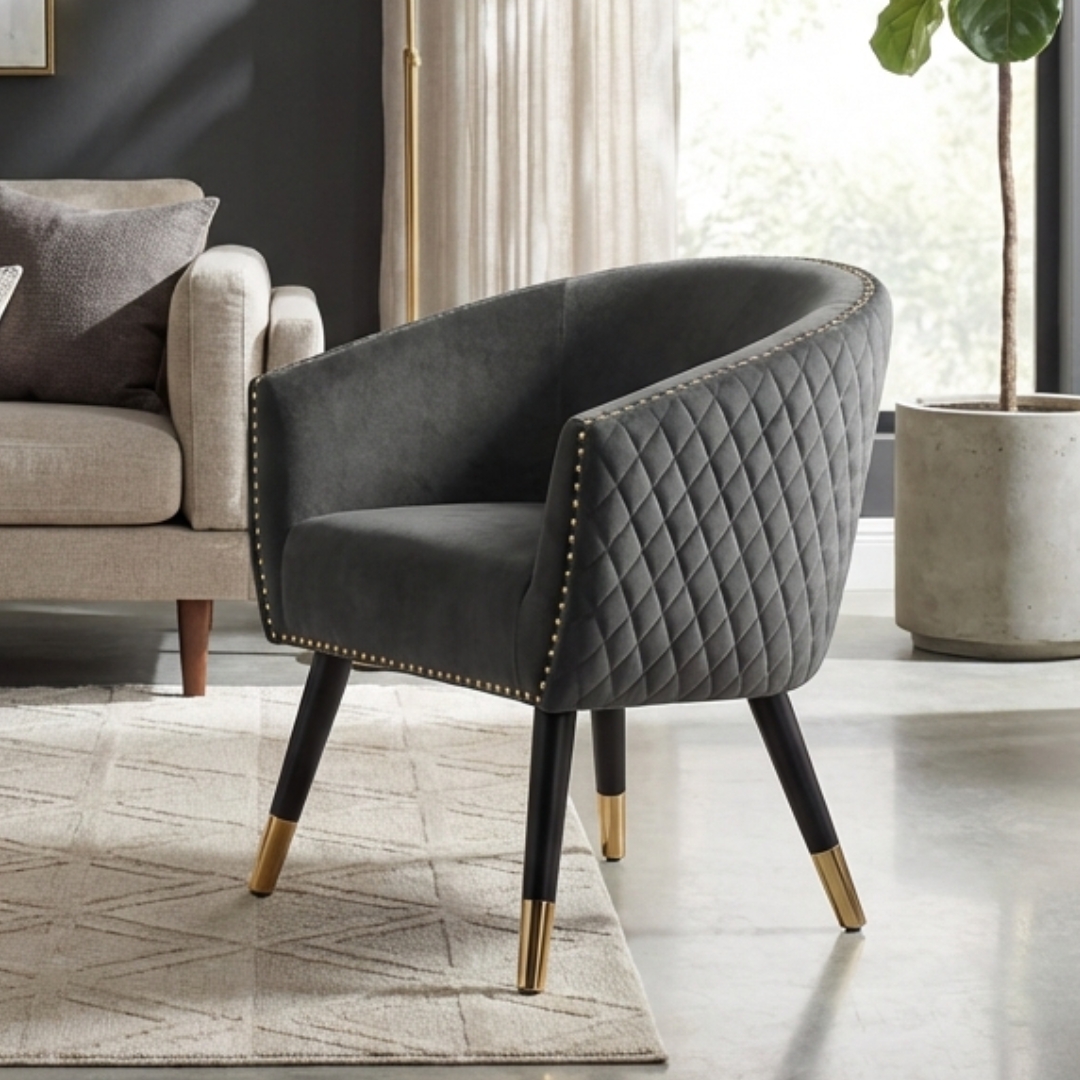 DENIS 金色脚套休闲单人沙发,尽显奢华格调。靠背采用精美的菱格纹绗缝设计,并点缀复古铜钉装饰,极具质感。实木椅脚搭配亮眼金边脚套,稳固耐用的同时也提升了整体空间的艺术气息,是您休闲角落的完美点睛之笔。