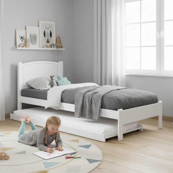 THOMAS Solid Wood Single Size Bed Frame With Pull Out-White