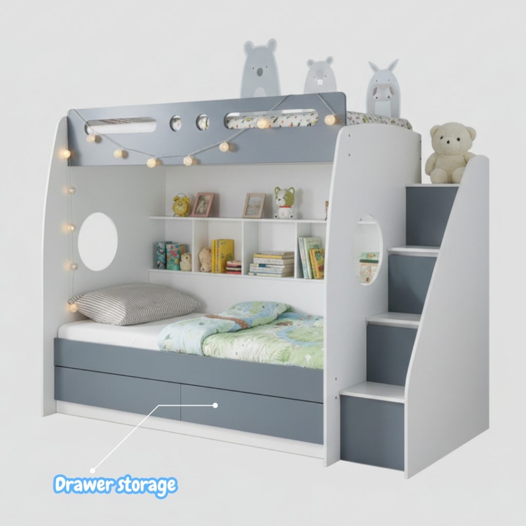 OREO 梯子双层床,下铺配有抽屉式收纳空间,轻松整理衣物、书籍或玩具。侧边稳固梯子设计,方便孩子上下,安全又可靠。功能与空间利用兼备,是儿童房或小户型家庭的理想选择。