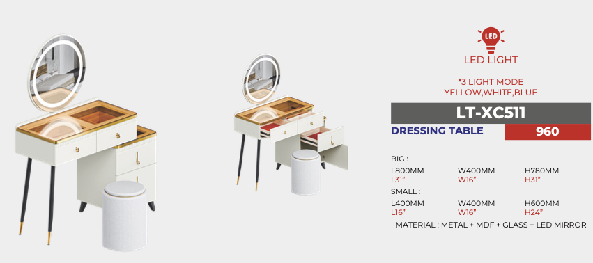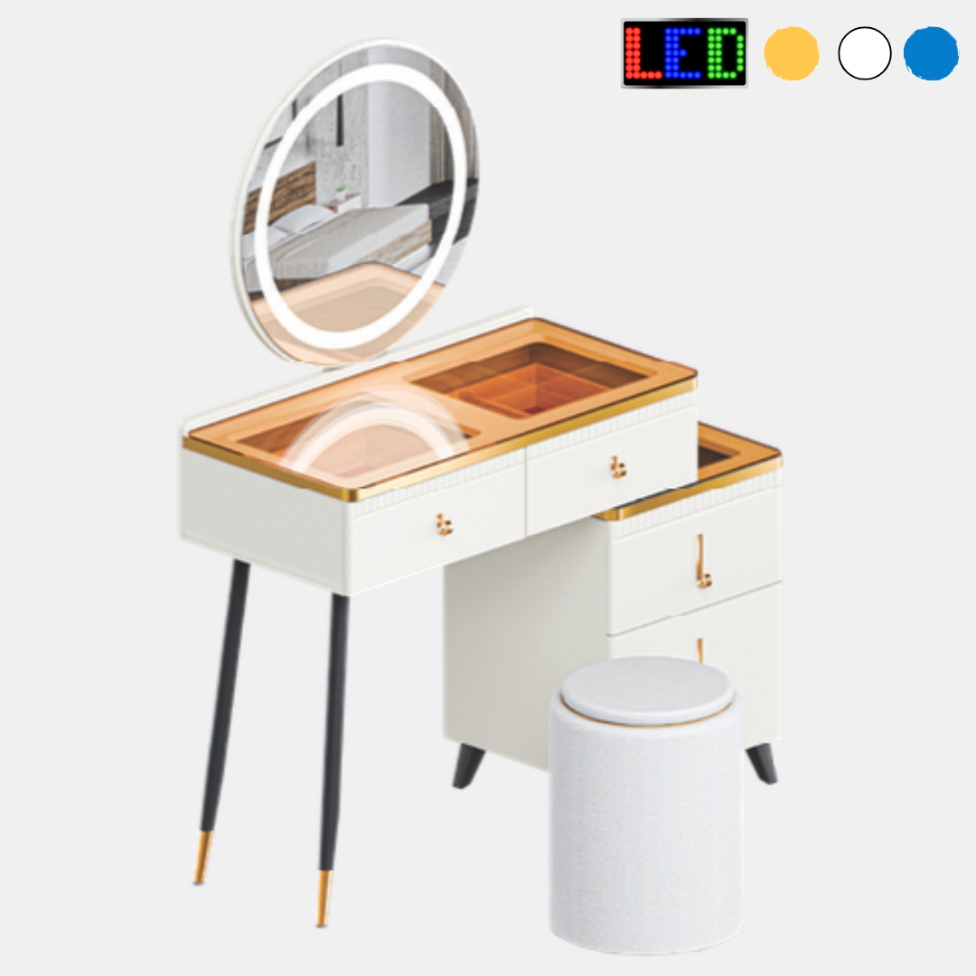 Illuminate your beauty space with the ERIN Expandable Dressing Table Set. This modern vanity is designed for both display and function. It features a unique see-through glass tabletop, allowing you to showcase perfumes or accessories, while the expandable design adapts easily to your room size. The set is completed by a stylish round mirror equipped with LED ambient lighting, ensuring perfect, custom lighting for flawless makeup application every time. ERIN blends high-end aesthetics with practical, flexible utility.