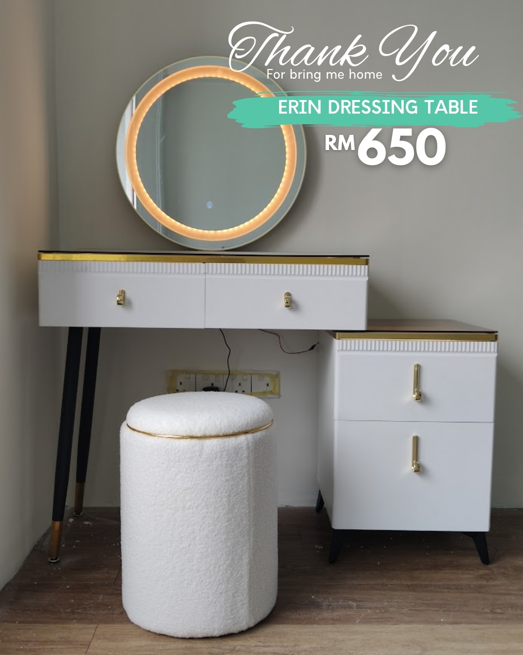 Serlahkan ruang kecantikan anda dengan Set Meja Solek Boleh Dipanjangkan ERIN. Meja solek moden ini direka untuk fungsi dan pameran. Ia menampilkan bahagian atas meja kaca lut sinar yang unik, membolehkan anda mempamerkan wangian atau aksesori, manakala reka bentuk boleh dipanjangkan mudah disesuaikan dengan saiz bilik anda. Set ini dilengkapi dengan cermin bulat bergaya yang mempunyai lampu ambien LED, memastikan pencahayaan yang sempurna untuk solekan yang tidak bercela. ERIN menggabungkan estetika mewah dengan utiliti yang fleksibel.