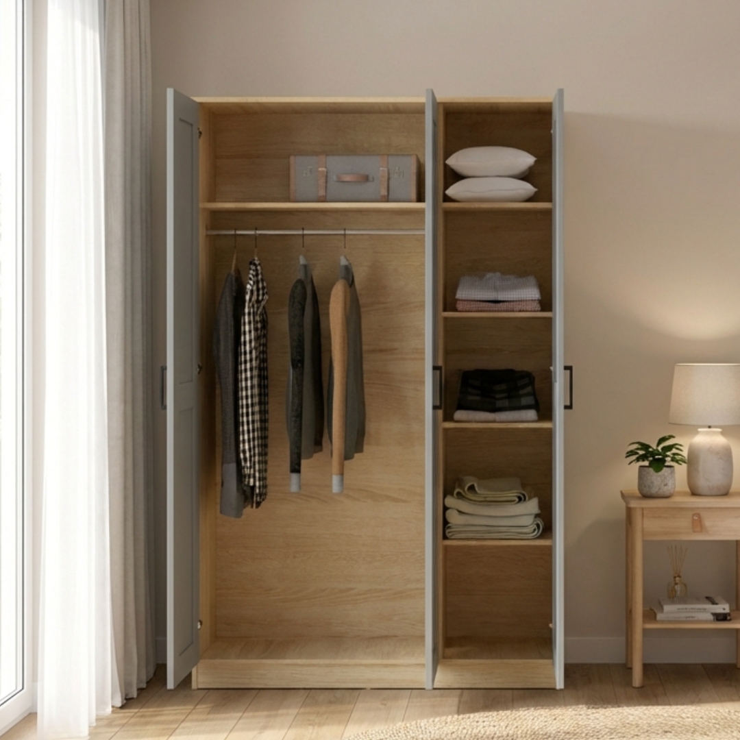 - FENKEL 3 Door Soft Closing Wardrobe-Oak+Grey