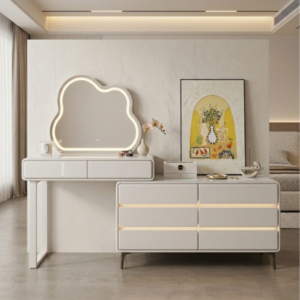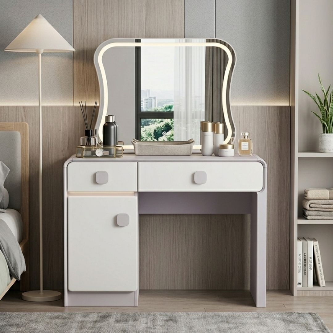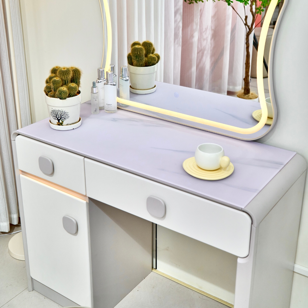 FINCH LED 梳妆台套装,兼具美观与实用。配备钢化玻璃桌面与大弧角设计,安全防磕碰。LED 镜支持多色温调节,满足不同妆容需求。随附舒适搭配坐凳,让梳妆体验更轻松。