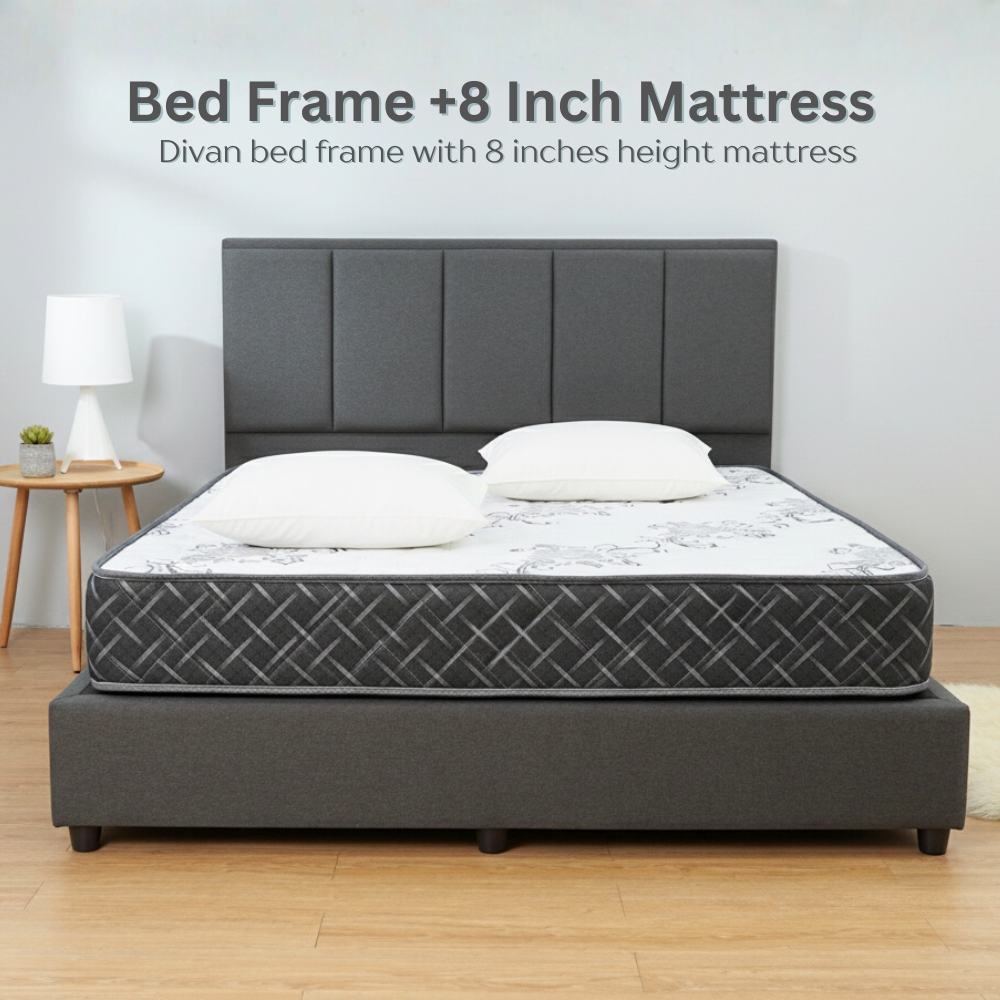 - This package included 1 x Divan Bedframe, 1 x 8″ Foam Mattress, 2 x Polyester Pillows