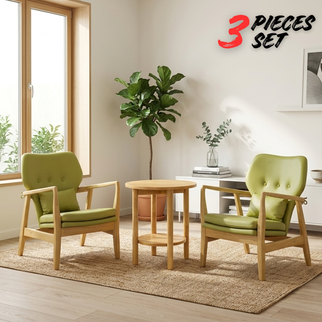 Create the perfect relaxation corner with the JENNIFER 1+2 Wooden Lounge Set. This elegant trio features two relax chairs and one matching side table, all masterfully crafted from full solid rubberwood for superior durability. Designed with comfort in mind, the chairs provide the ideal spot for a morning coffee or an evening read. Available in two calming fabric tones: Green and Blue.