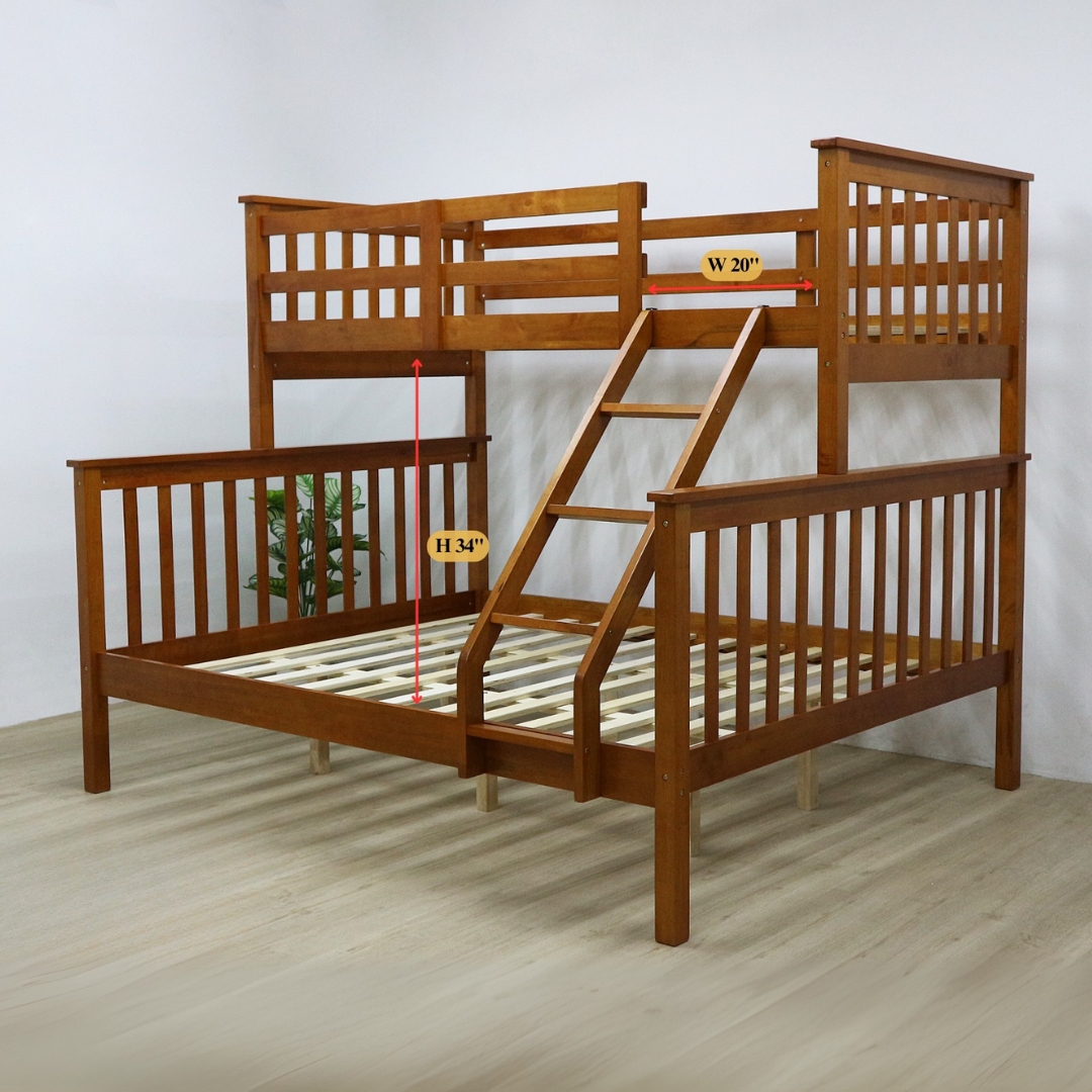 Katil Bertingkat JONNY direka dengan kombinasi bijak: satu katil bujang di atas dan satu katil queen di bawah, menjimatkan ruang dan sesuai untuk bilik perkongsian. Diperbuat daripada kayu getah padu yang kukuh, serta dilengkapi tangga keselamatan. Praktikal, tahan lama dan sesuai untuk kegunaan keluarga.