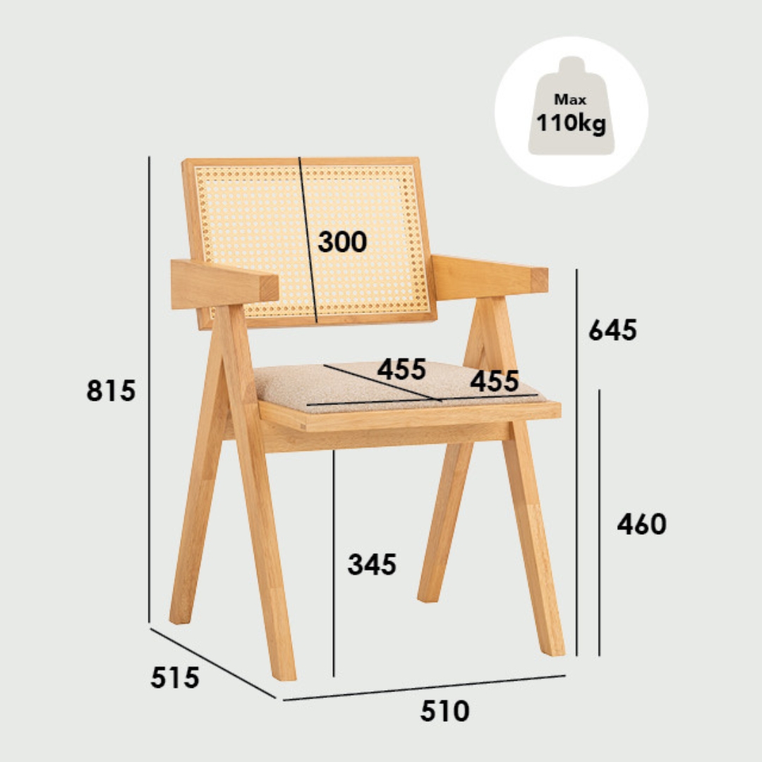 Set Meja Makan 6-Kerusi KAIRA diperbuat daripada kayu getah padu yang tahan lama. Kerusi dilengkapi sandaran rotan sintetik, kusyen tempat duduk dan lengan untuk keselesaan tambahan. Tersedia dalam warna natural atau hitam, sesuai untuk gaya Japandi, tropika atau kontemporari.