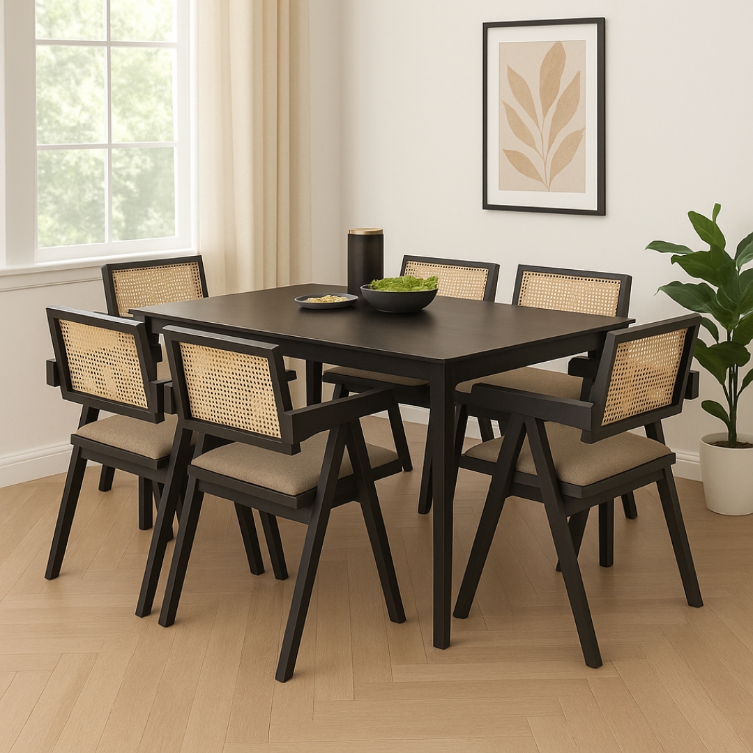 The KAIRA 6-Seater Dining Set blends natural charm with modern comfort. Crafted from solid rubberwood, it features chairs with synthetic rattan backrests, soft cushion seat pads, and elegant armrests for added support. Designed for both style and durability, this set is available in natural or black finishes—perfect for Japandi, tropical, or contemporary interiors.
