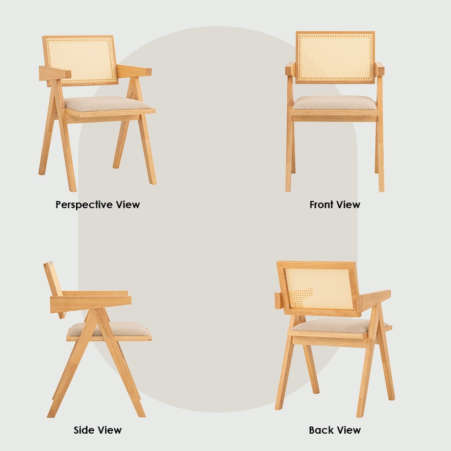 Set Meja Makan 6-Kerusi KAIRA diperbuat daripada kayu getah padu yang tahan lama. Kerusi dilengkapi sandaran rotan sintetik, kusyen tempat duduk dan lengan untuk keselesaan tambahan. Tersedia dalam warna natural atau hitam, sesuai untuk gaya Japandi, tropika atau kontemporari.