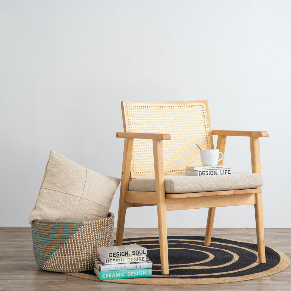Introducing the KAIRO Solid Wood Lounge Chair, featuring a durable solid rubberwood frame and a stylish synthetic rattan backrest. This elegant lounge chair comes with a comfortable cushion seat pad, making it perfect for any living space. Combining natural materials with modern design, the KAIRO lounge chair offers both comfort and sophistication. Enhance your home decor with the timeless beauty and functionality of the KAIRO Solid Wood Lounge Chair.