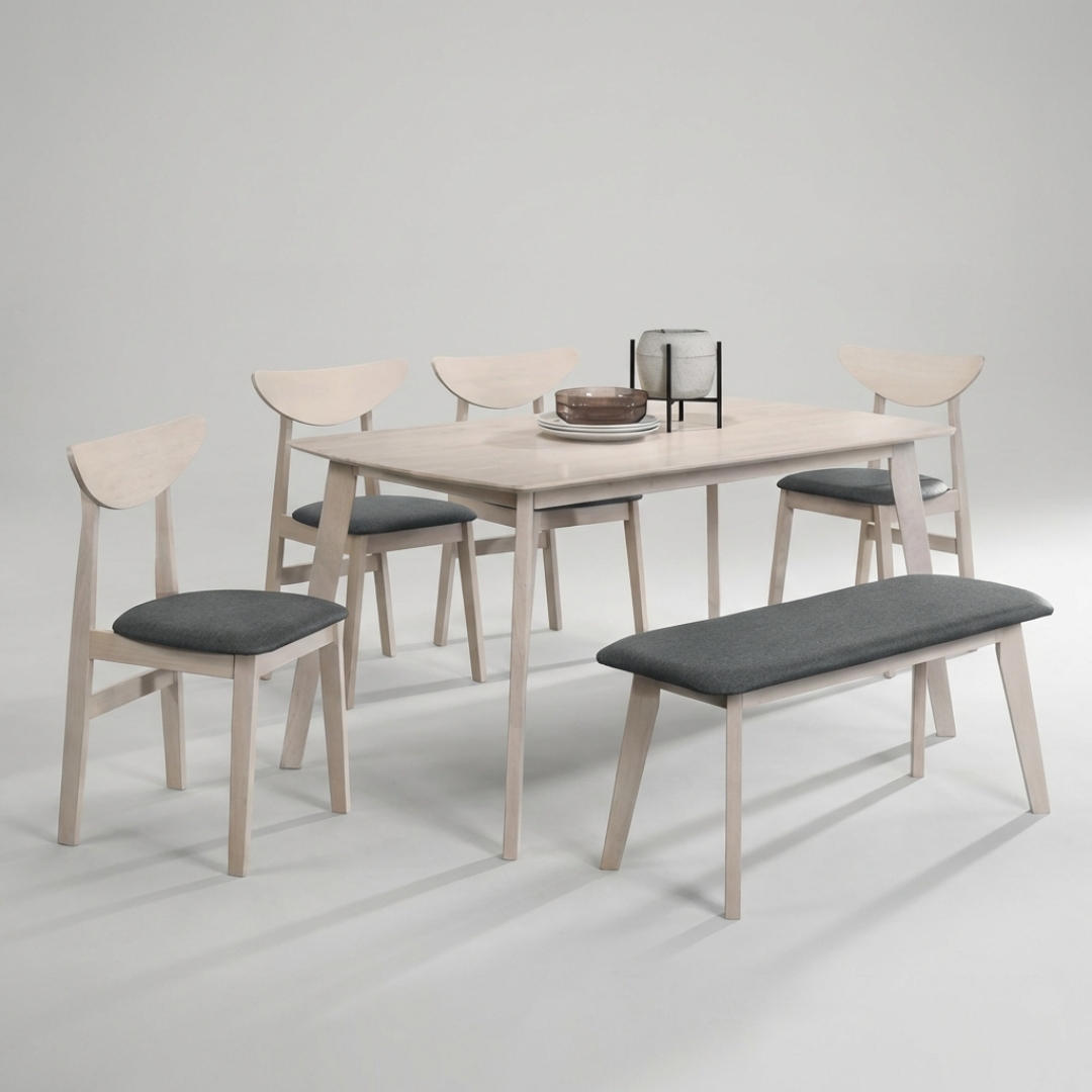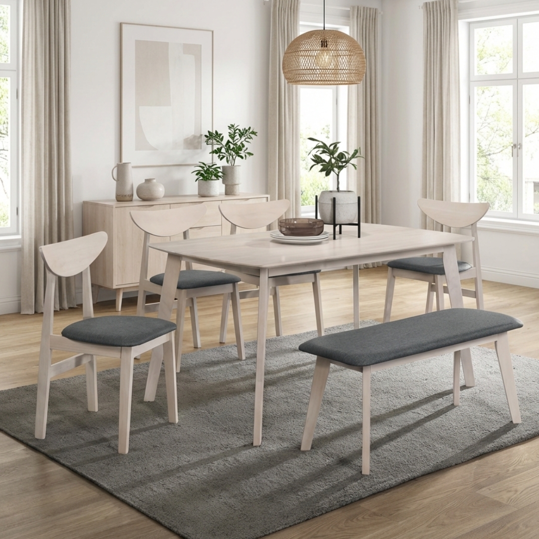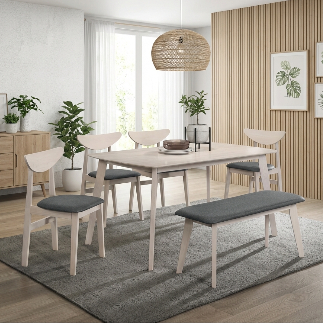 KENJI Full Solid 6 Seater Dining Set-White Wash