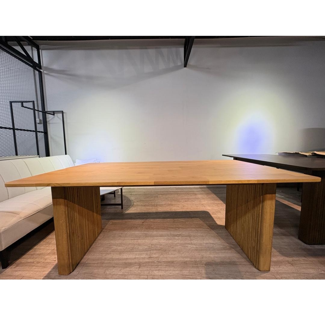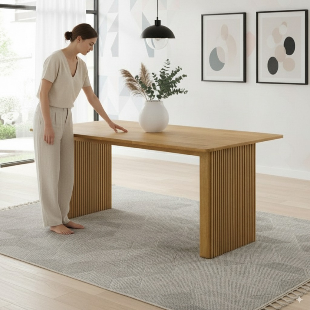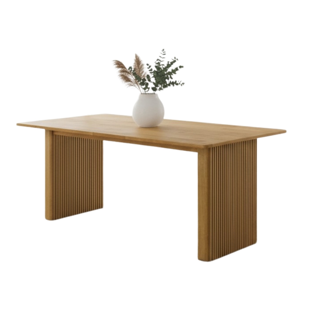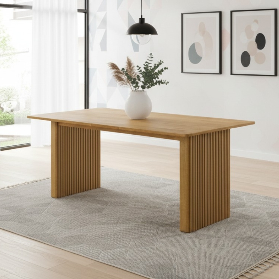 Introducing the KOOPER Solid Slatted Wood Dining Table, crafted from 100% solid rubberwood for strength and timeless beauty. Available in 150cm and 190cm, KOOPER is designed to suit both cozy apartments and spacious homes. Inspired by Japandi design, it combines Japanese minimalism with Scandinavian warmth, creating a calming dining atmosphere. The natural wood grain adds elegance, while the slatted details bring modern character. Durable, functional, and stylish, KOOPER is the perfect centerpiece for family meals, gatherings, or daily use. Upgrade your dining space with furniture that blends nature, comfort, and design harmony.
