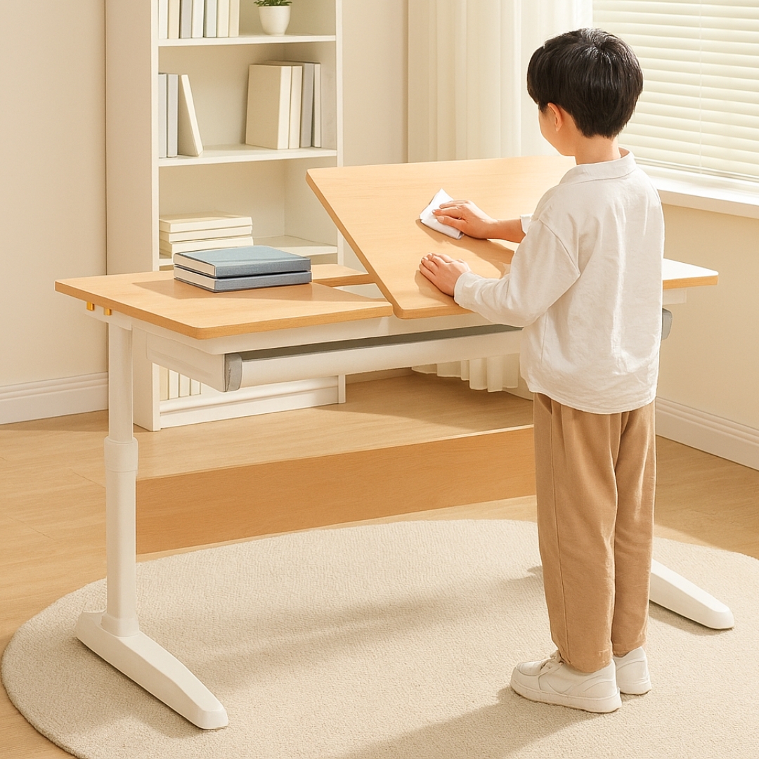 Support your child’s posture and focus with the L23S Kids Ergonomic Study Desk. Made with zero-formaldehyde melamine board, it ensures a safe, eco-friendly workspace. The tabletop tilts up to 50°, ideal for reading, writing, or drawing. With a waterproof and scratch-resistant surface plus a spacious drawer, this desk blends durability and functionality. Available in 100cm and 120cm lengths to suit different study spaces.