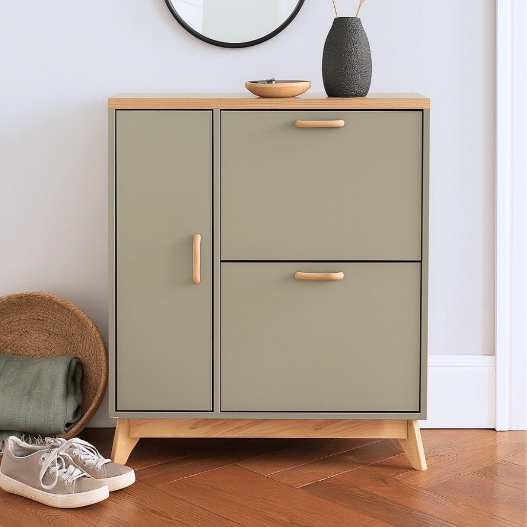 The LAGOS Shoe Cabinet is a smart, space-saving solution with a slim 30cm narrow depth—perfect for entryways or small spaces. Designed with multi-storage compartments and double-layer flip-open sections, it helps keep shoes organized and easy to access. Featuring a solid wood base and handle, it combines natural charm with modern practicality for any home.