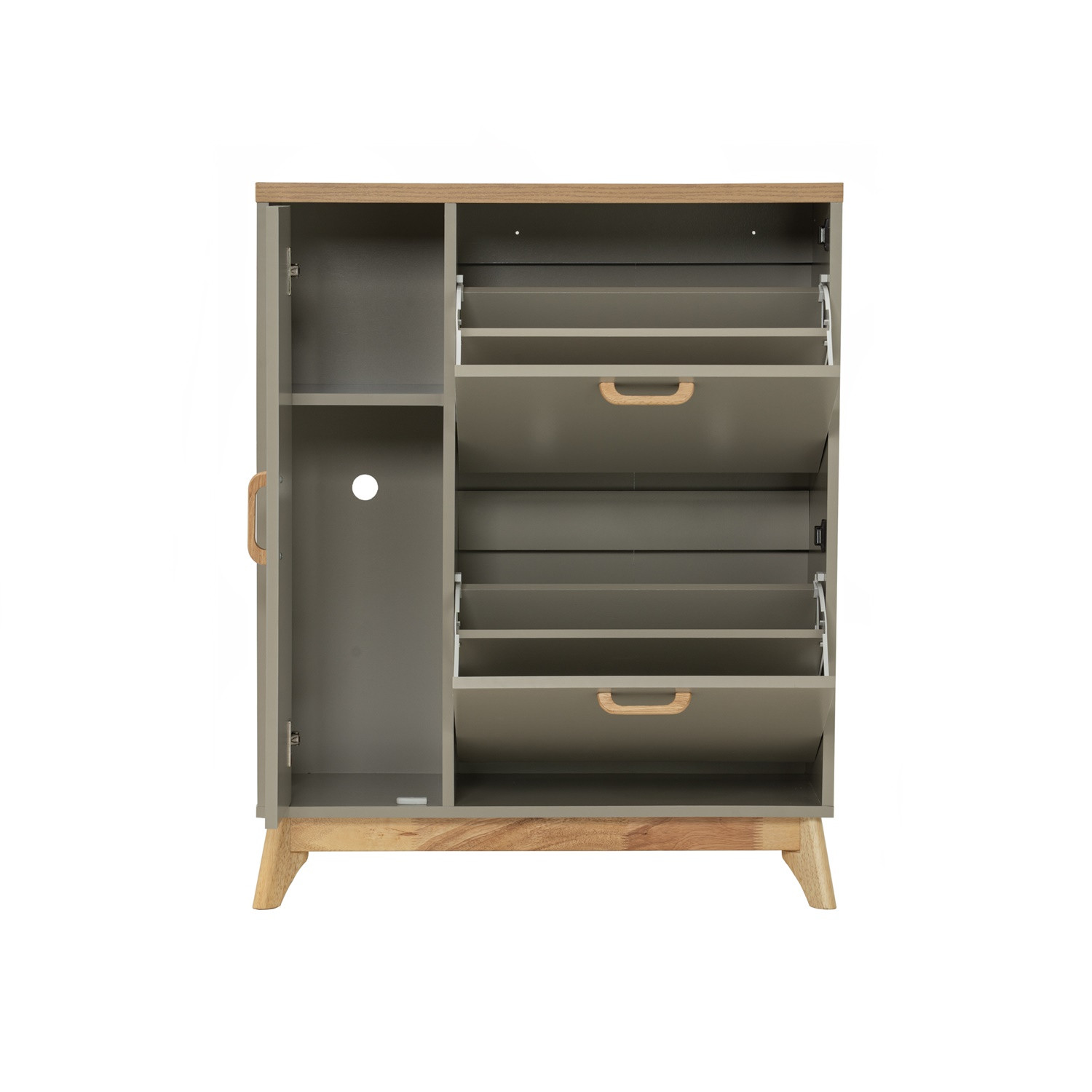 LAGOS 鞋柜以仅 30cm 的窄深设计,轻松适配玄关或小空间。双层翻盖收纳设计与多功能隔层,让鞋履收纳井然有序,取放方便。搭配实木底座与木质拉手,兼具自然质感与实用功能。