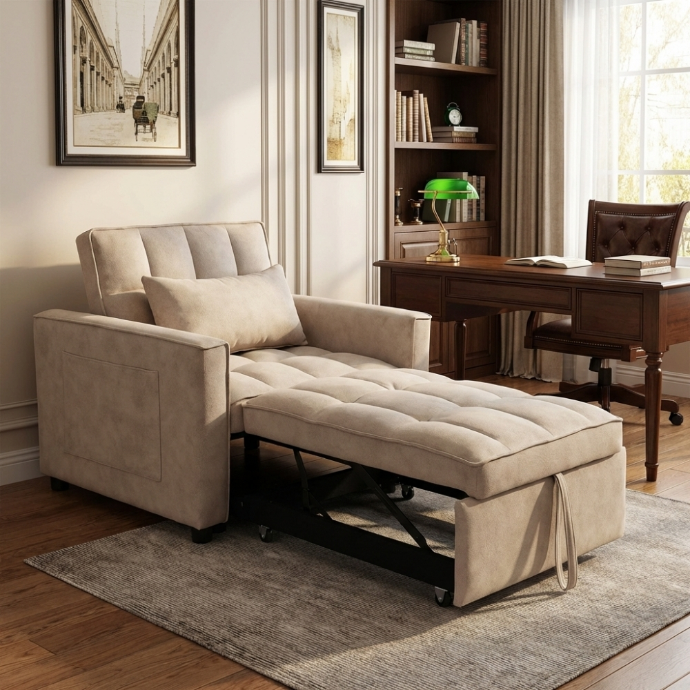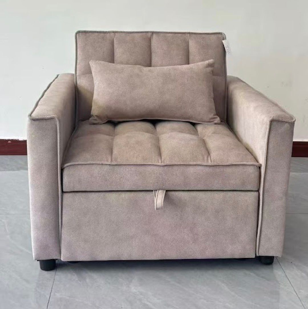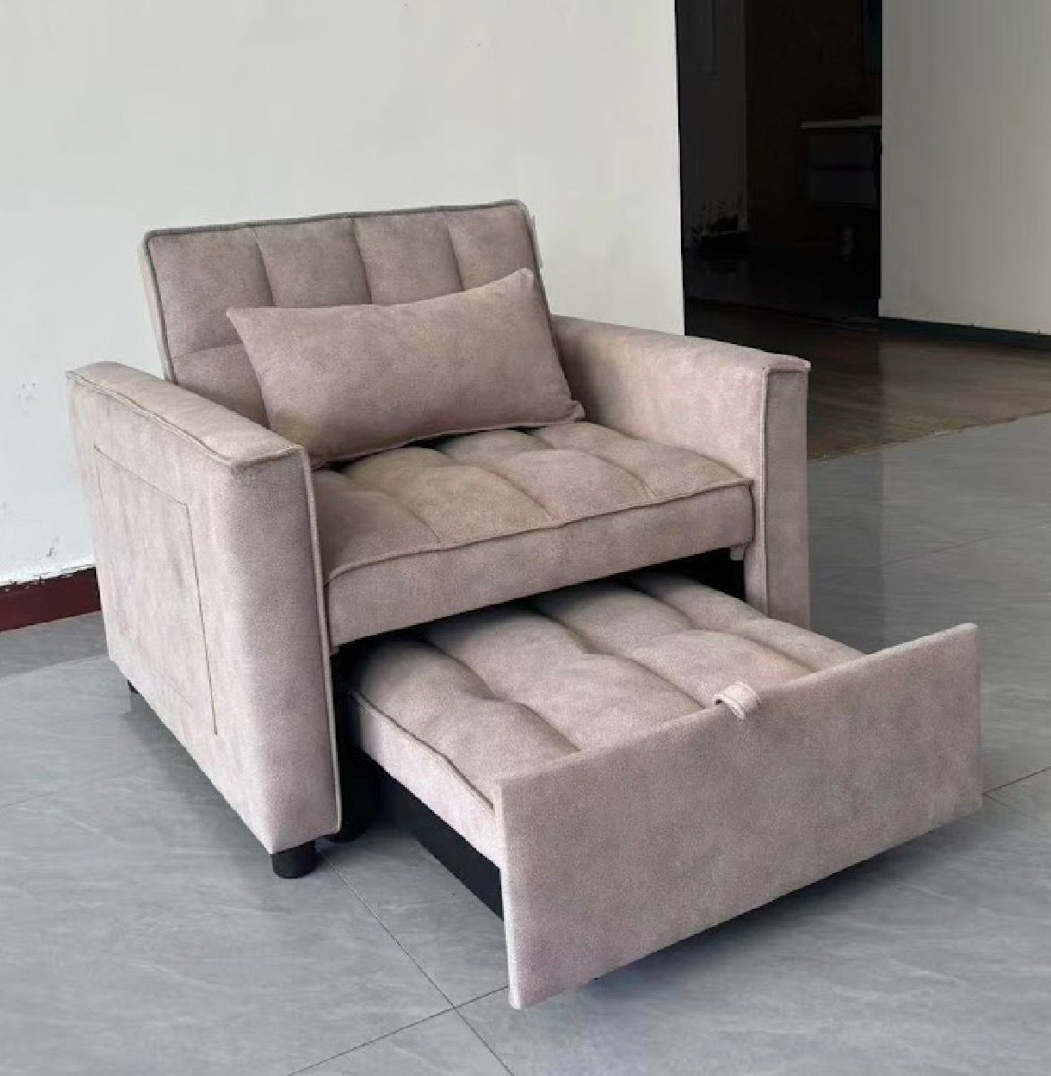 LEAH 单人拉出式沙发床,体积小巧,功能实用,适合小空间使用。采用易清洁布料包覆,配备全金属框架与顺滑拉出结构,轻松切换为床。扶手设有收纳袋,附赠两个抱枕,兼顾舒适与收纳,是居家或接待来客的理想选择。