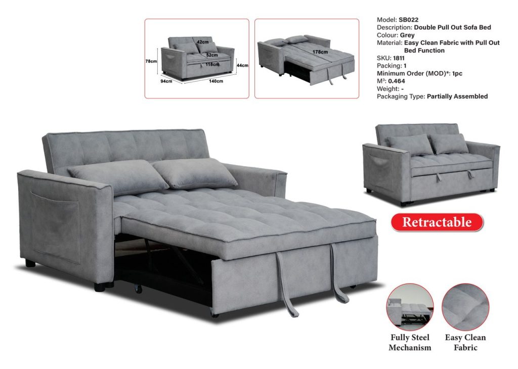 Sofa Katil Tarik 2 Tempat Duduk LEAH direka untuk ruang terhad dengan fungsi serbaguna. Fabrik mudah dibersihkan dan rangka logam penuh memastikan ketahanan serta mekanisme penarikan yang lancar. Sandaran tangan dilengkapi poket simpanan, dan disertakan dua bantal hiasan—sesuai untuk berehat atau menerima tetamu bermalam.