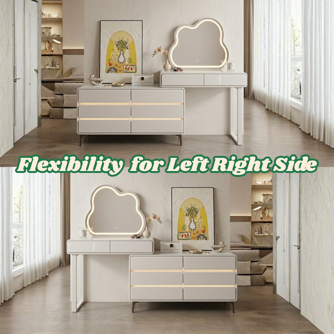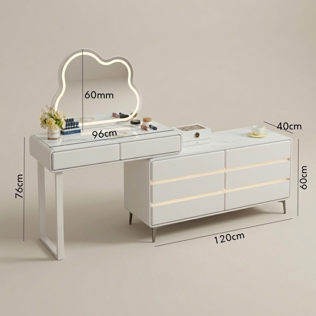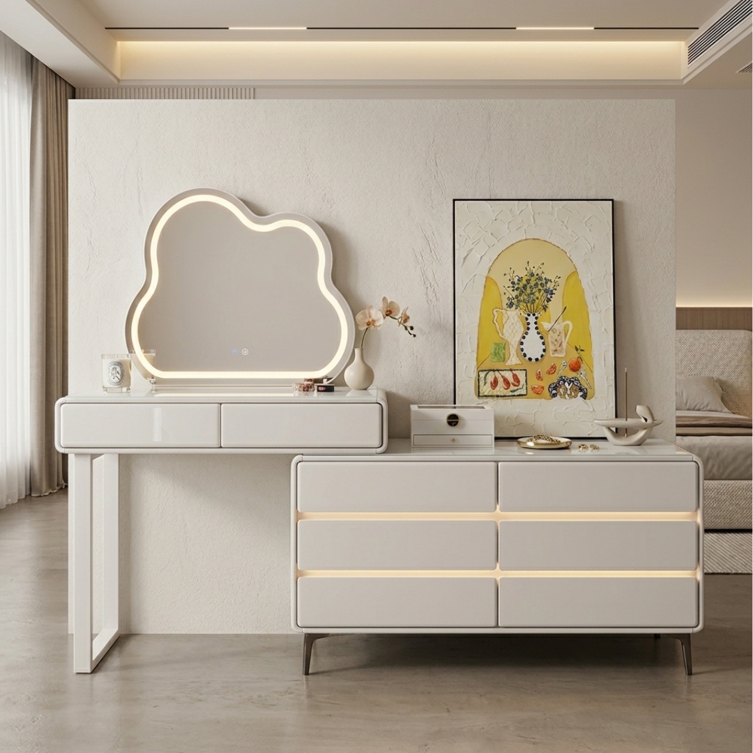 Introducing the 2237 Dressing Table Set, featuring a cloud-shaped touch sensor LED mirror and a luxurious sintered stone table top. This elegant set includes eight spacious drawers for ample storage, perfect for organizing your beauty essentials. The unique design combines modern aesthetics with high functionality, enhancing any bedroom or dressing area. Experience the perfect blend of style and practicality with the 2237 Dressing Table Set.