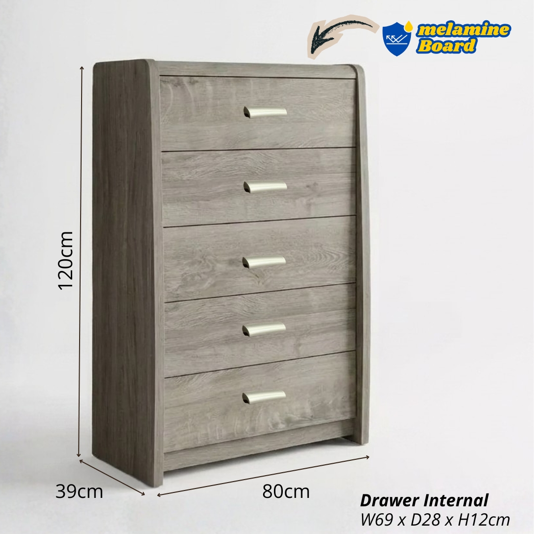 Susun atur ruang kediaman anda dengan lebih kemas menggunakan Almari Laci LENAR. Menampilkan permukaan melamina berkualiti tinggi dengan warna Grey Oak yang moden, ia sangat tahan lasak dan kalis calar. Bahagian atasnya direka dengan profil melengkung (curved profile) yang unik untuk keselamatan dan gaya yang lebih sofistikated. Siri LENAR ini hadir dalam tiga pilihan kapasiti iaitu 3, 5, dan 6 laci, menjadikannya sangat fleksibel untuk kegunaan di bilik tidur, ruang tamu, atau pejabat anda.