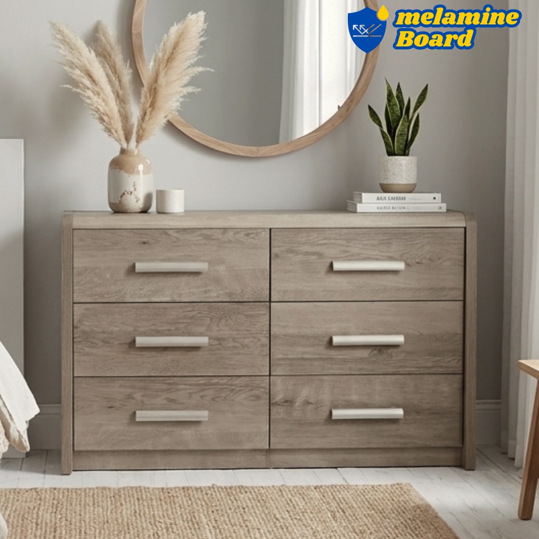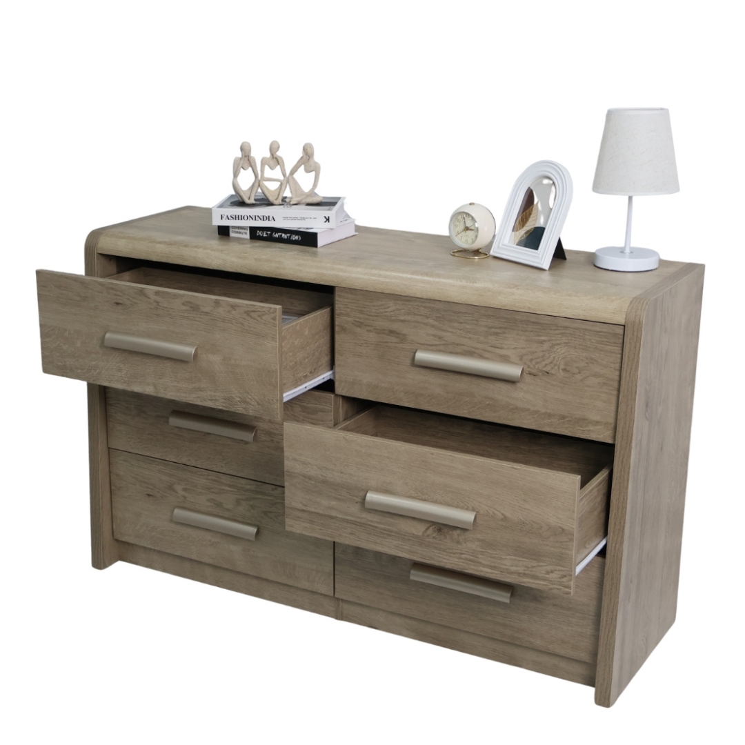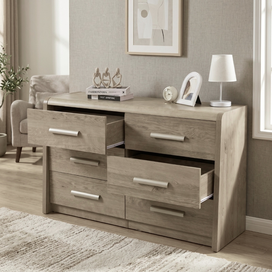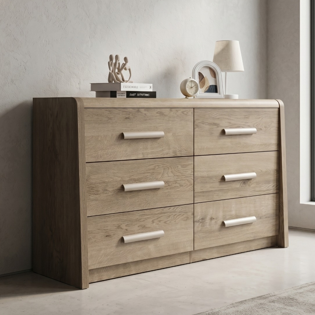 Organize your home with the sleek and functional LENAR Chest of Drawers. Matching the modern aesthetic of the LENAR series, this chest features a premium melamine top in a sophisticated Grey Oak color that is both scratch and moisture-resistant. A unique curved profile on the top edge adds a designer touch while ensuring safety with smooth corners. To fit any space or storage need, the LENAR is available in 3, 5, and 6-drawer configurations, making it perfect for bedrooms, hallways, or even as a stylish office organizer.