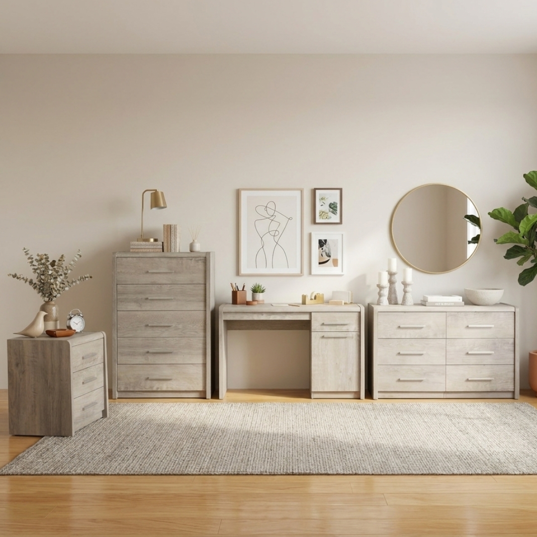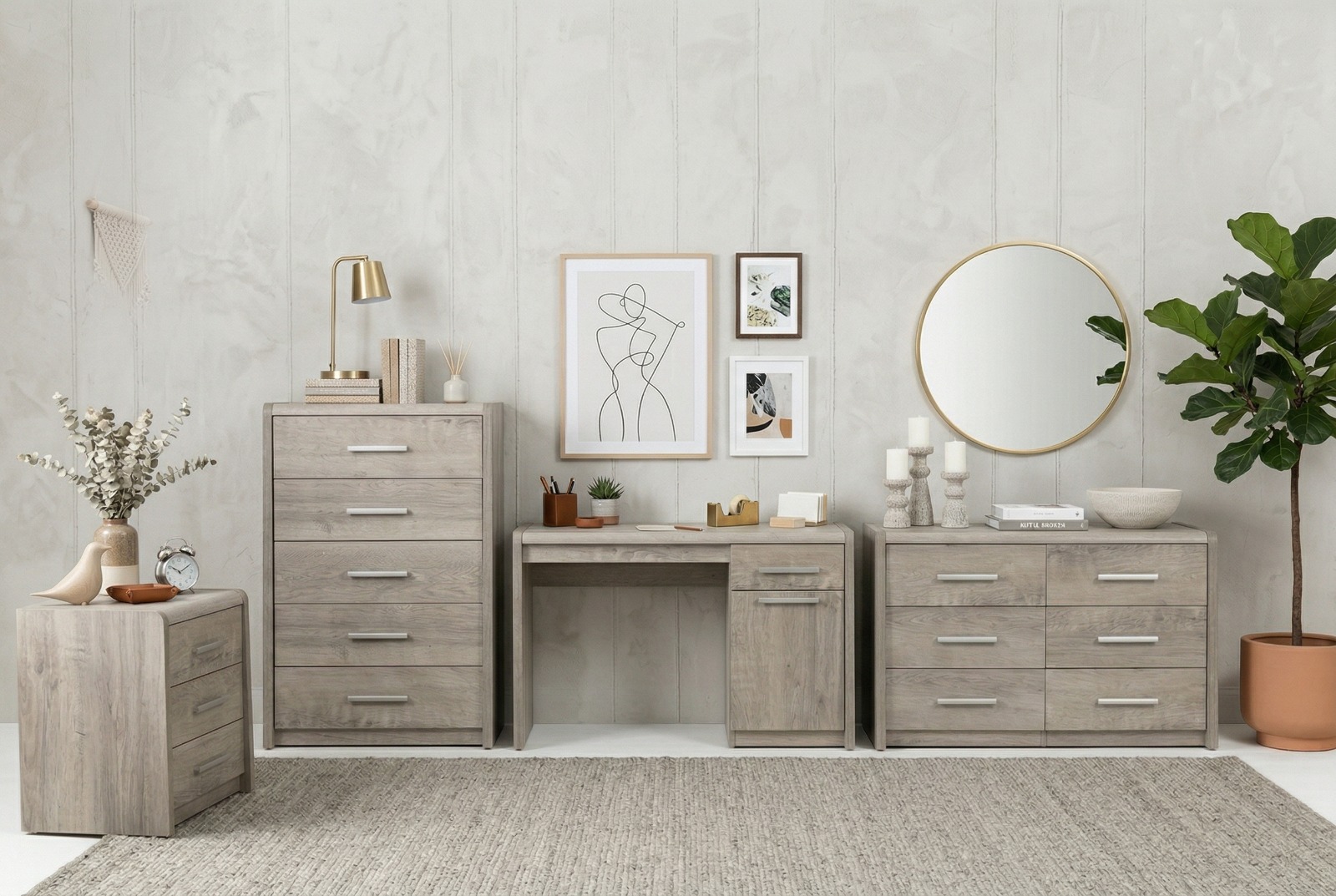 LENAR 现代简约抽屉柜系列,为您的居家收纳提供更优雅的选择。柜顶采用高品质三聚氰胺板(Melamine),配以极具高级感的灰橡木色(Grey Oak),防刮耐磨且易于打理。顶部的弧形修边设计(Curved Profile)不仅提升了视觉设计感,更增加了使用的安全性。为了适配不同空间,该系列提供三斗、五斗及六斗柜三种规格选择,无论是存放衣物还是收纳居家杂物,都能轻松应对。