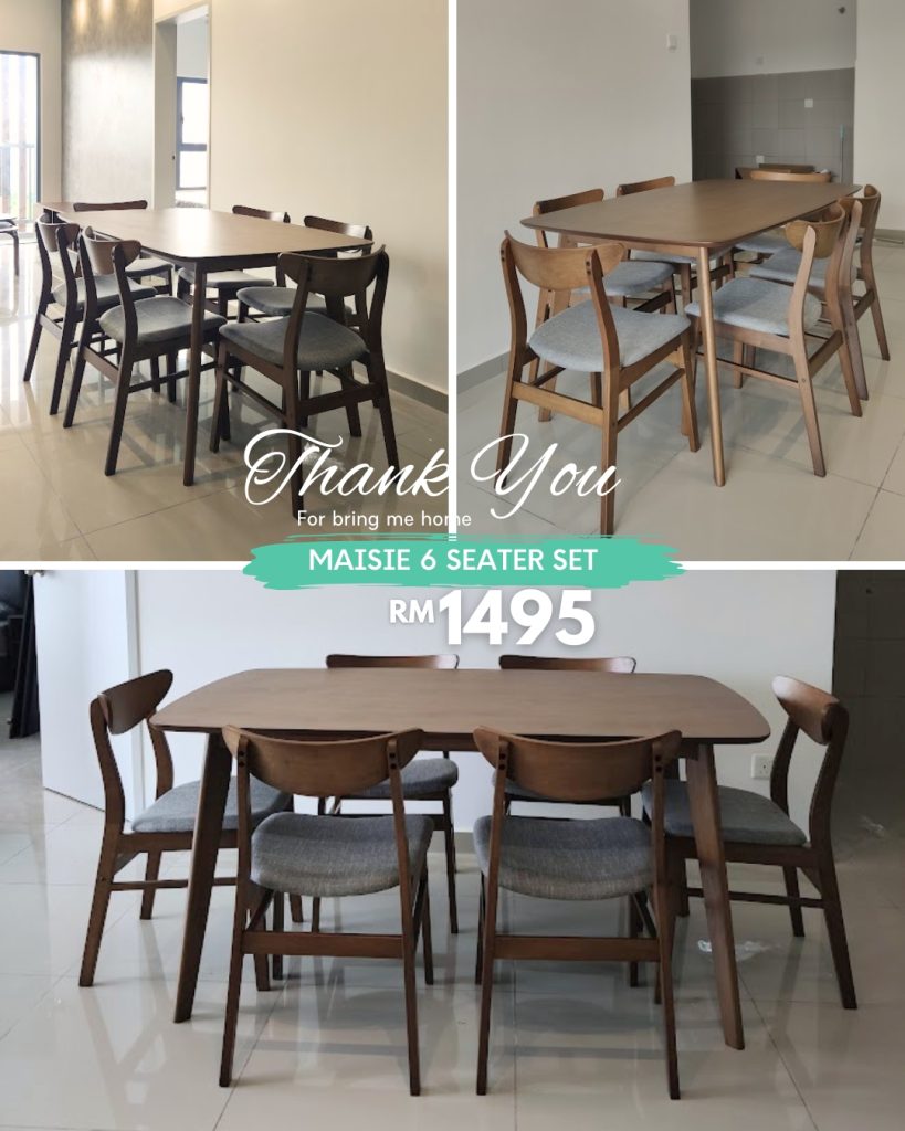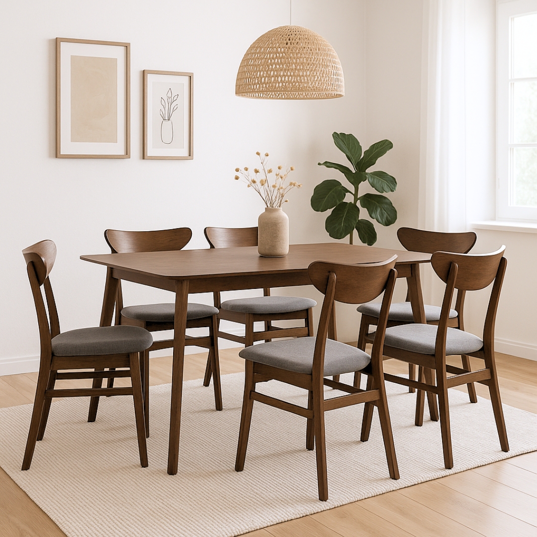 The MAISIE 6-Seater Dining Set offers a perfect blend of comfort and timeless design. Made from solid rubberwood, it ensures durability and natural warmth. Each chair features a curved backrest for ergonomic support and a soft fabric cushion seat pad for added comfort. Ideal for family meals and gatherings, MAISIE complements both modern and classic dining spaces.