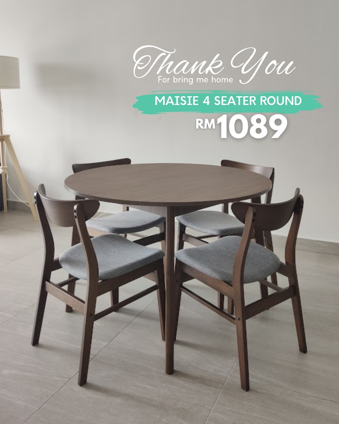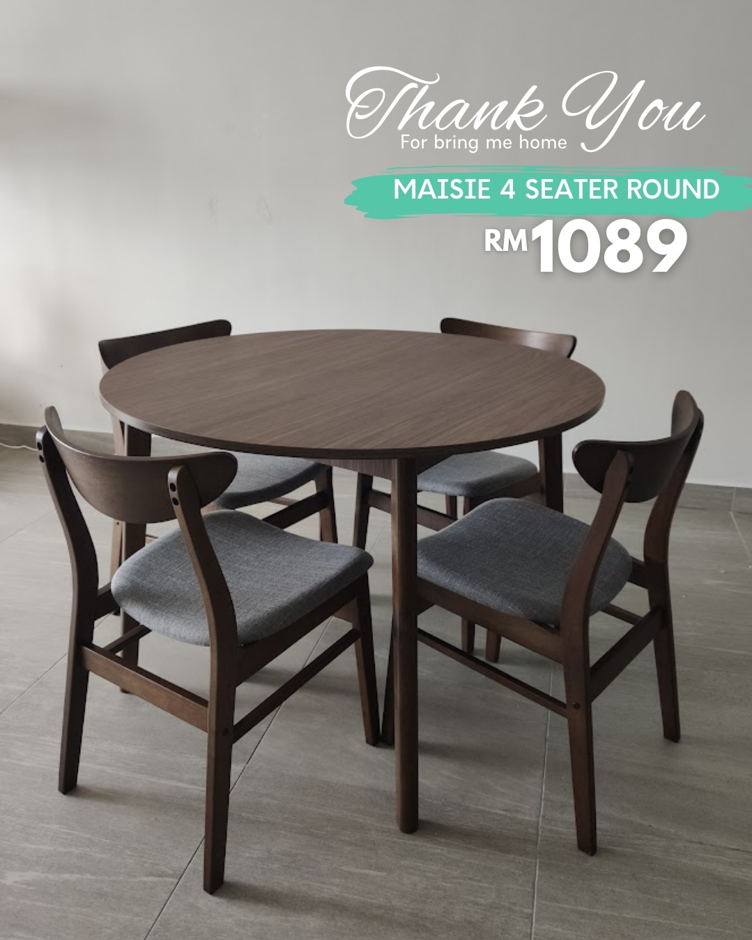 Nikmati hidangan keluarga dengan selesa dan bergaya bersama Set Meja Makan Bulat 4 Kerusi MAISIE. Set ini sangat praktikal untuk kegunaan harian; meja mempunyai permukaan melamin anti-calar yang mudah dijaga dan tahan lama. Dibina daripada Kayu Getah Solid yang kukuh, kerusi-kerusi MAISIE direka untuk keselesaan, menampilkan pelapik kusyen fabrik lembut dan sandaran melengkung ergonomik. Reka bentuk bulatnya menggalakkan perbualan akrab dan sesuai untuk ruang makan yang lebih kecil.