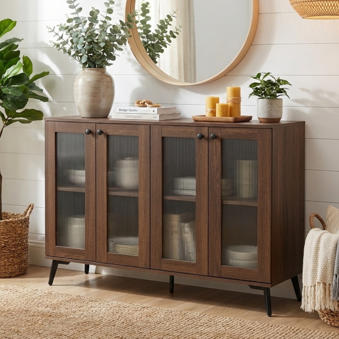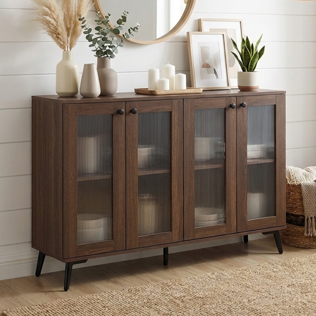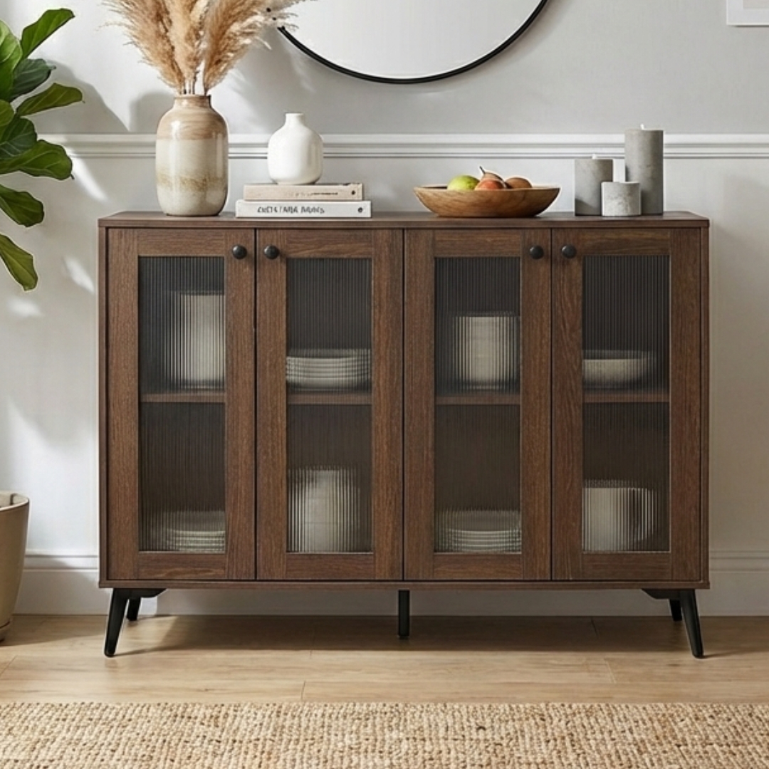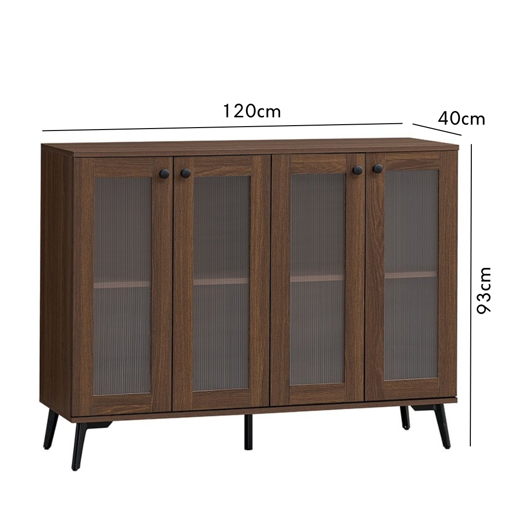 Add a touch of sophisticated organization to your dining or living room with the MARLOWE 4-Door Sideboard. Dressed in a rich walnut color, this expansive sideboard offers a classic yet modern aesthetic that fits any contemporary interior. It is constructed from durable particle board and elevated by sturdy metal legs, allowing for easy cleaning underneath. The highlight of this piece is the privacy acrylic door panels, which elegantly conceal your dinnerware or media accessories while adding a unique textured visual. With its generous four-door storage, the MARLOWE sideboard is the ultimate solution for a clutter-free and stylish home.